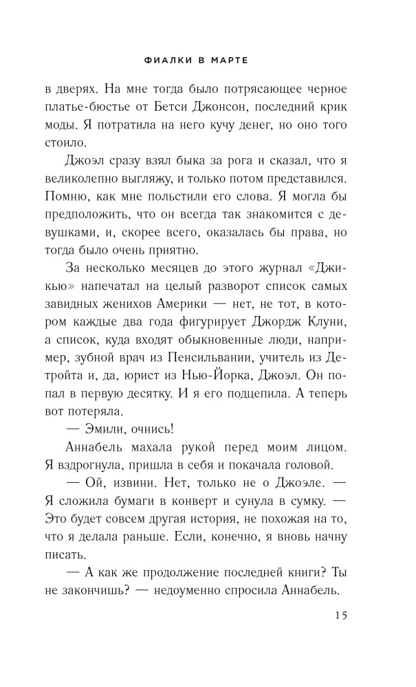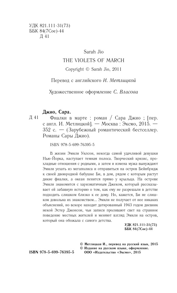 Прочитала первую книгу Сары Джио "Ежевичная зима", книга очень понравилась. Добрая,красивая сказка и в то же время без намека на стандартный женский роман. Читалась очень легко. Ждала когда выйдут еще книги этого автора, поэтому заказала "Фиалки в марте", думаю тоже не буду разочарована.