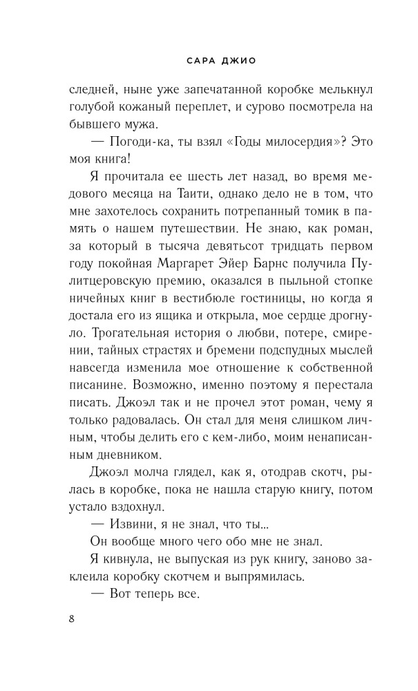 Долга думала на счет этой книги. Прочитала кучу положительных отзывов на нее. И все таки я ее заказала и прочитала. Книга понравилась своим оформлением, листы в ней тоненькие, есть специальная закладка что удобно при чтении самой книги, книга сама маленькая и удобная если например взять ее в дорогу. Что можно сказать о содержании самой книги, читается она конечно легко. Но мне не очень понравились первые 100 станиц немного было не понятно что, где, кто. Я думаю это от того что эта книга была первой из того что написала автор. Но в середине книги был просвет самой истории и начинаешь понимать что, где и как. История прошлого была захватывающая, интересная, были переживания по самой истории Эллиота и Эстер. Что же там было на самом деле и чем все закончится. Но концовка совсем не понятно, было такое ощущение что она немного не закончила свой рассказ, историю. Скажу свое мнение в общем книгу можно заказывать как легкий роман в дорогу, над которым можно даже поразмыслить. Но я все таки надеюсь что следующий книги Сары Джио будут немного захватывающими и запоминающимися.