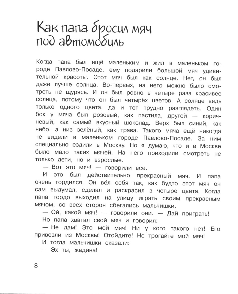 Книга состоит из небольших рассказов, каждый из которых начинается магическими словами "Когда папа был маленький...", и как продолжение, то - папу дразнили девочки, и он плакал, боялся слезть со шведской стенки и над ним смеялся весь класс, у него была кличка, он прогуливал уроки и т.д. Ценность этой книги не в том чтобы "сбить" нимб с головы пап сегодняшних, а в том чтобы подсказать ребенку – как можно решить такие ситуации, что делал "маленький папа" в таких случаях. Задорно написана, очень смешная интересная и легкая книга! Картинки через разворот, правда, весьма самобытные:-), шрифт крупный и четкий. Аудитория от 7 лет и старше.