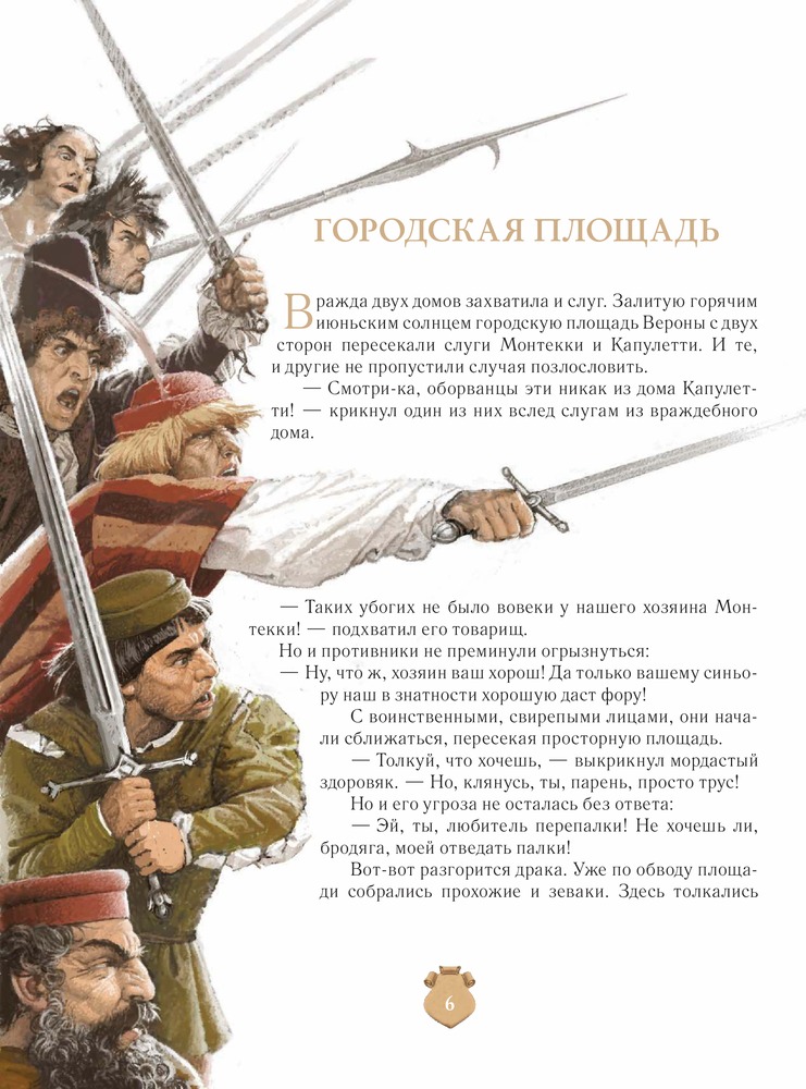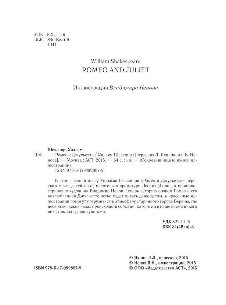 Не знаю, плакать или смеяться... Ожидала получить произведение Шекспира, а получила краткую адаптацию для детей младшего школьного возраста. В описании книги про это ничего не сказано. К самому изданию претензий нет. Иллюстрации очень хороши, художнику браво! Бумага плотная, глянцевая, печать красочная. Глаз радуется. А вот мозг радоваться не может, так как текст, простите, чрезвычайно плох. Это даже не адаптация, это плохой пересказ. Написано реально плохо. Это единственный минус: данной книги, но минус существенный. Получается, иллюстрации рассчитаны на старший возраст, а текст для детей до 10 лет.