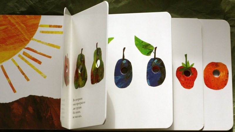 Сюжет - неделя из жизни всёпоедающей гусеницы. Стиль картинок, как на обложке. Есть маленькие дырочки для крошечных пальчиков так, как гусеница проедала дырочки и ползла дальше - на следующую страницу. "...В понедельник она насквозь прогрызла одно очень большое яблоко. Но не наелась. Во вторник она прогрызла две груши. Но опять не наелась. В среду она прогрызла целых три сливы. И все равно не наелась. В четверг ей удалось прогрызть четыре спелых ягоды клубники. Но и этого оказалось мало..." и так далее....
