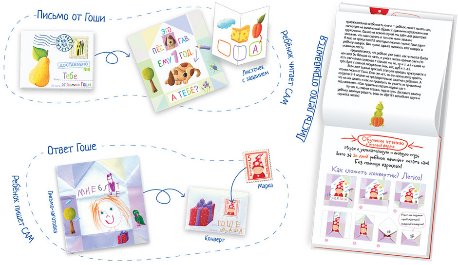 Купила внучку 4 лет 10 мес, который знает буквы и слоги, но не хотел читать и писать. Он в руки не хотел брать книгу, бежал как от огня. Заинтересовался письмами гномика. Читаем письма Гоши. Написали вместе ответ. Скоро оформим еще одно письмо. В общем, незаметно процесс чтения стронулся с мертвой точки. Правда , в тупик поставил вопрос ребенка о том, что сможем ли мы пойти в гости к гномику. Но кое-как выкрутилась. Что касается самого пособия, то надо отдать должное и самой идее, и качеству исполнения. Flipу отдельное спасибо за оперативность и сервис.