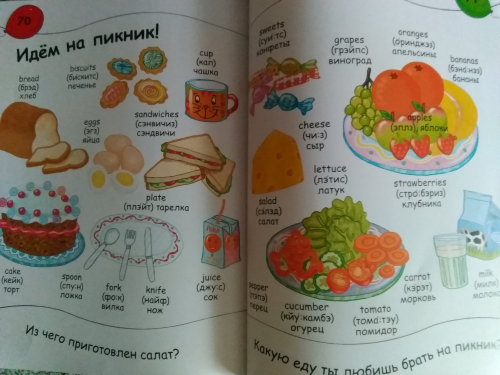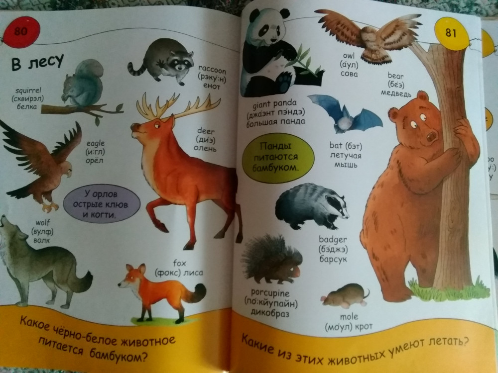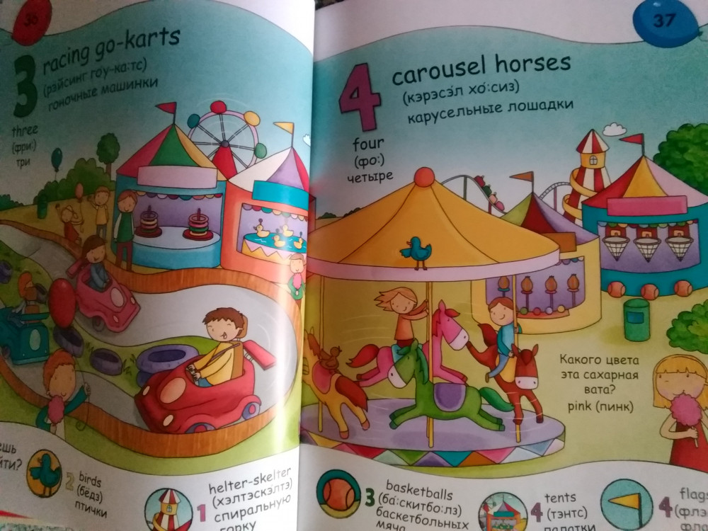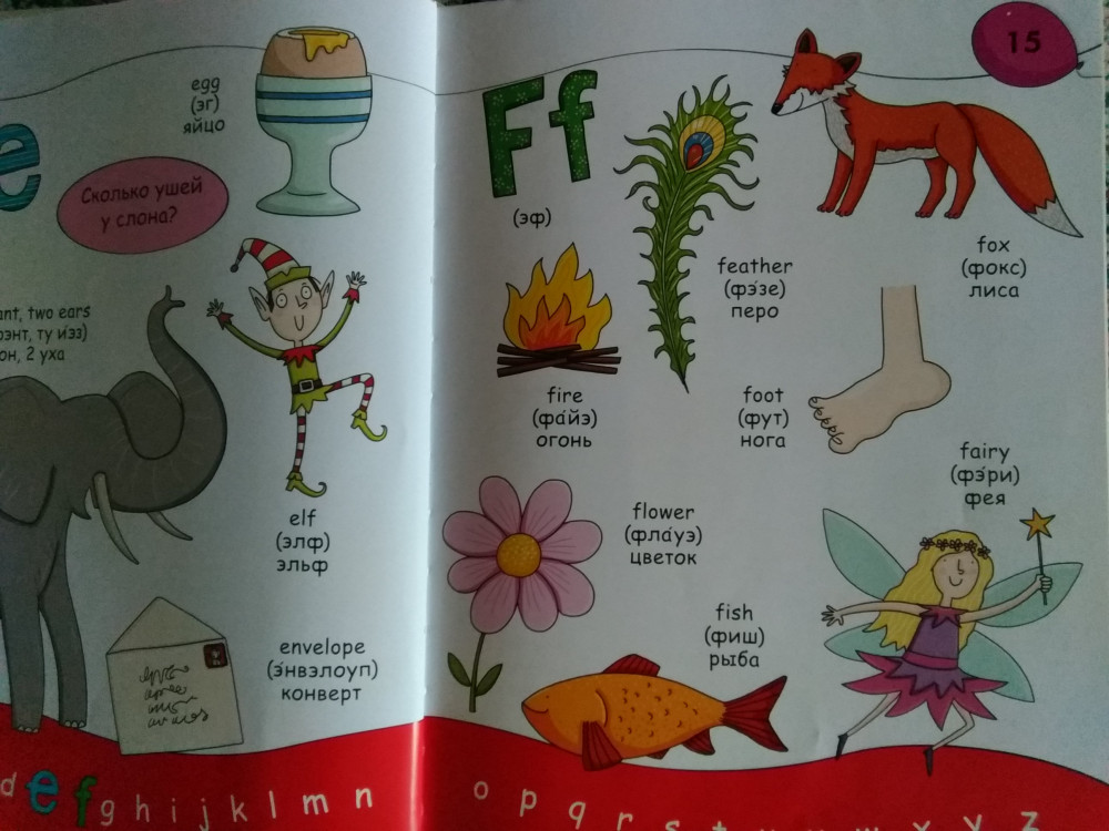 Книга дочку очень заинтересовала, ей 4,5года. Первое время постоянно ее листала, просила с ней позаниматься, с удовольствием повторяет слова, они расположены в алфавитном порядке английского языка. Какие то слова уже знает, называет, любит играть в учителя при этом. Картинки и слова достаточно крупные. Цифры обучают счёту до 20. Раздел Мир вокруг включает слова о доме, улице, семье, частях тела и т.д. Ну и раздел о животных соответственно. Они разделены по местам обитания, есть некоторые дополнительные факты. Картинки яркие.