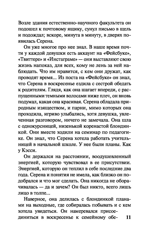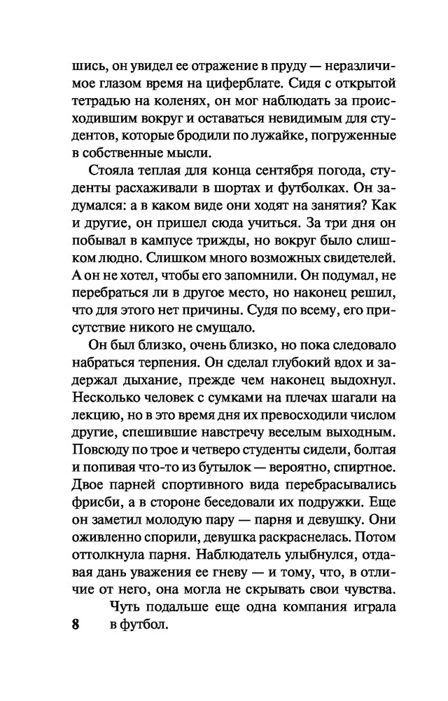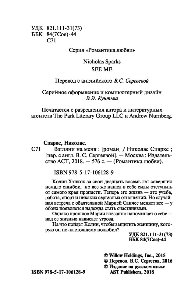 Заказ пришел в срок, мягкая обложка без дефектов. По поводу самой книги, прочитав на половину, могу сказать, что мне очень нравиться. Роман переплетается с детективом и держит в напряжении, из-за простоты текста читается на одном дыхании. Я не люблю описание природы на три страницы, здесь такого нет. В каждой книге Спаркса есть изюминка, так что для меня все его книги увлекательны. Кто же преследует Марию, останутся ли они с Колином, изменился ли он, на эти вопросы вы сможете ответить, прочитав эту книгу