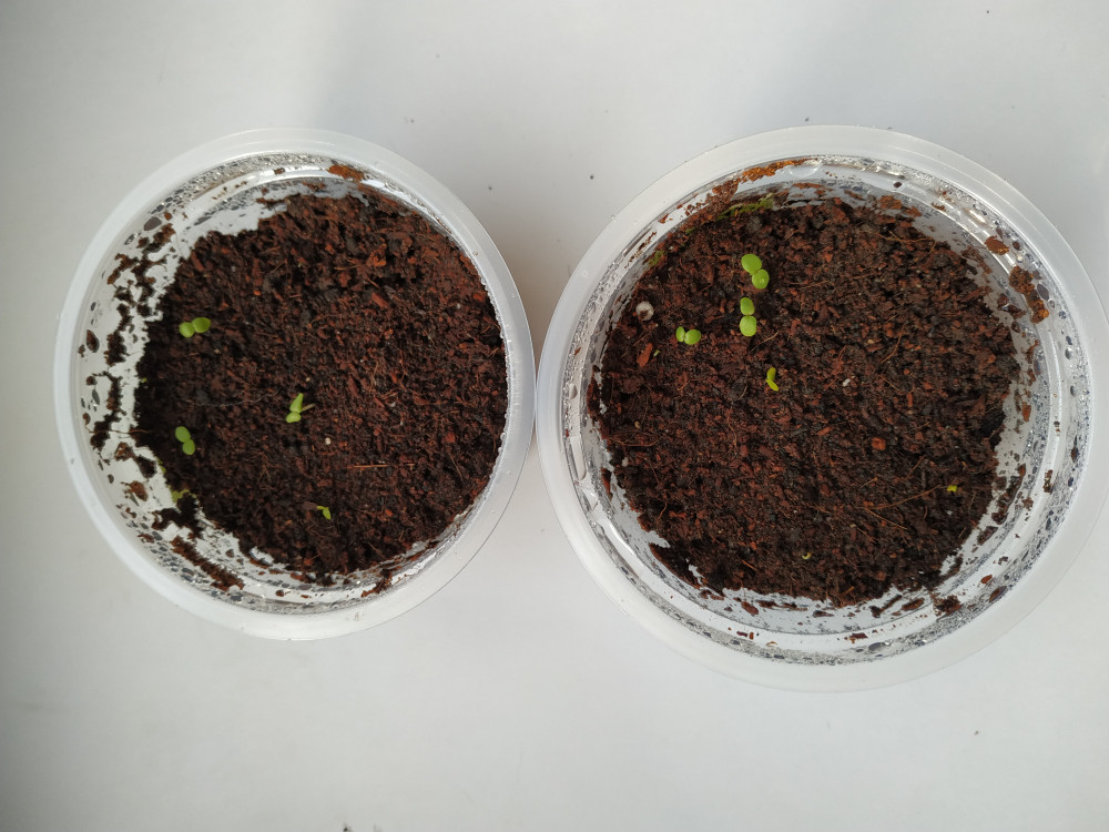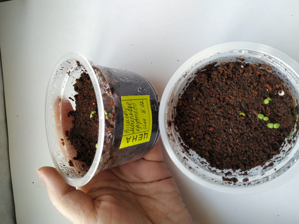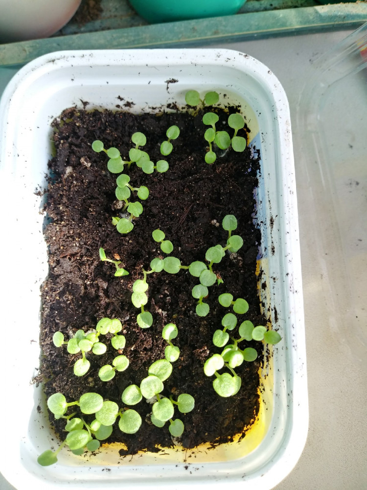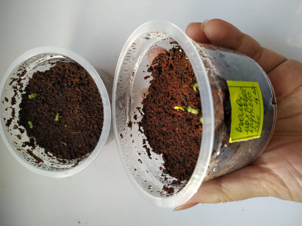 Посев 16.02.19. Семен много, 70 штук. Разделила их на две плошки.Первые всходы появились на 6 день в обоих плошках.Фото сделано сегодня 24.02.19. Пока процент всходов мал, но это мой первый опыт выращивания однолеток на рассаду. Пока стоят под крышкой.