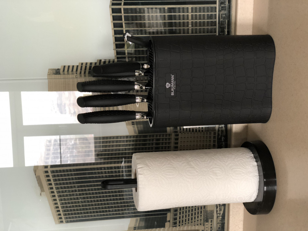 Ножи острые, удобные. Много вопросов вызвала подставка. Вытягиваешь нож - крышка поднимается вместе с ним. Приклеила. С прорезями для ножей пришлось не просто повозиться, а нагреть старый нож, чтобы проплавить монолит из пластмассы. Примерно три сантиметра. Все можно исправить, но я не люблю рукодельничать, чтобы довести новую вещь до ума. Хочется, чтобы сразу всё функционировало.