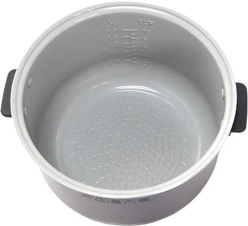 Объём чаши составляет 5 литров, поэтому в ней можно приготовить еду в расчёте на всю семью или на большое количество гостей. Разработчики предусмотрели керамическое покрытие, препятствующее пригоранию пищи. Оно устойчивое, его сложно поцарапать.