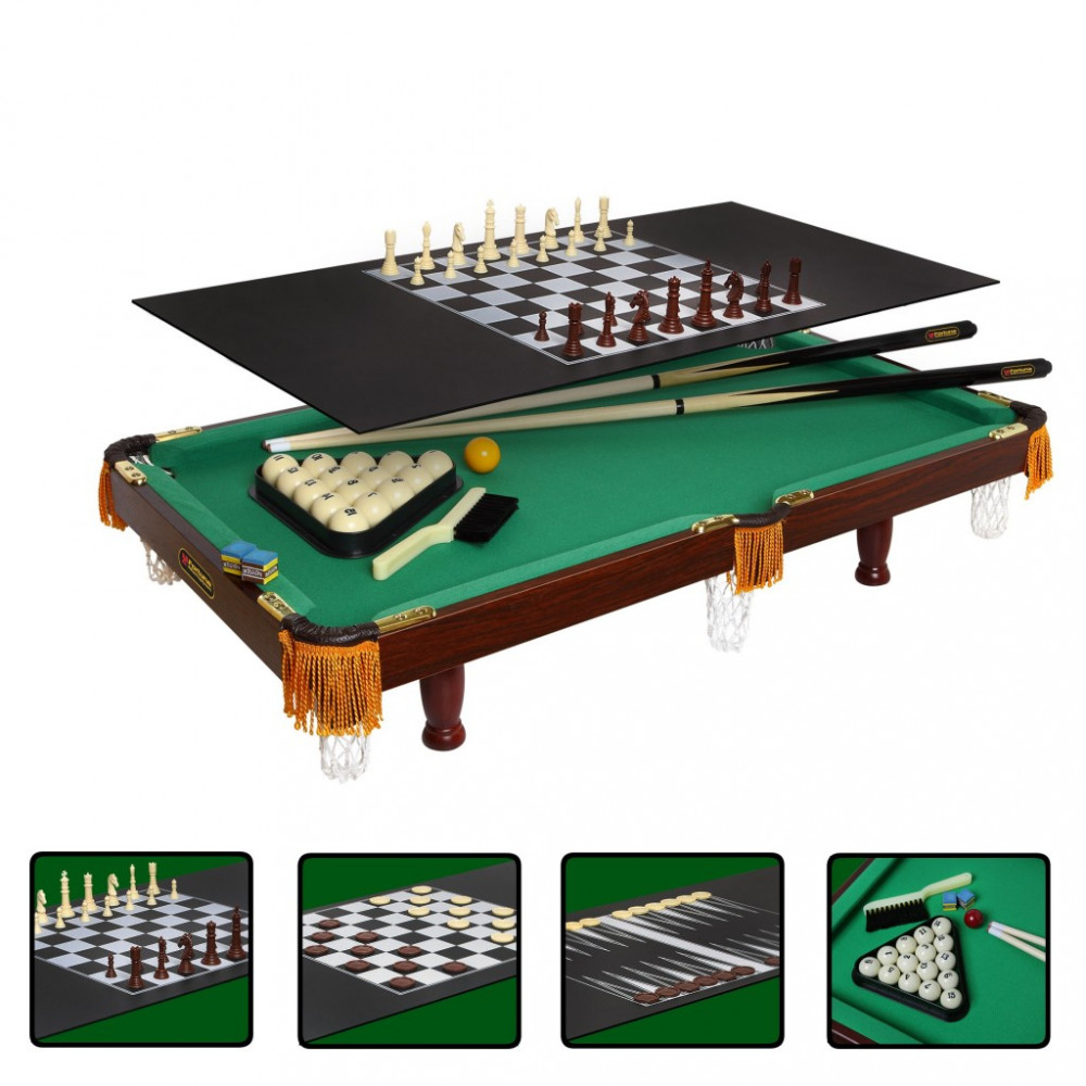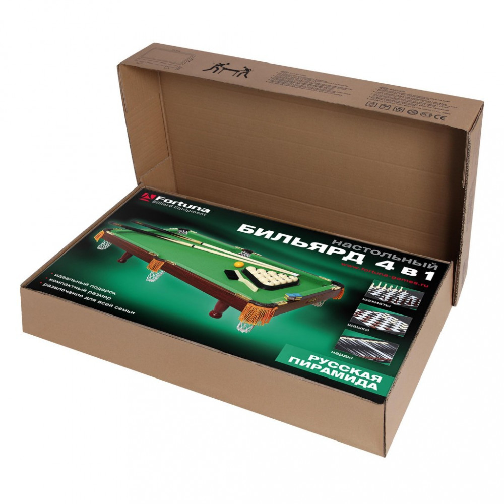 Fortuna Настольная игра «Бильярд 4 в 1»В данный момент этот товар отсутствует в продаже. Возможно, у нас найдется аналогичный или похожий товар здесь. Настольная игра «Бильярд 4 в 1» от российского бренда «Фортуна» — отличное развлечение для всей семьи. Она состоит из двух игровых полей. Первое предназначено для игры в «Русскую пирамиду», второе — дли шашек, шахмат и нард. Бильярдный стол выполнен из прочной древесины и покрыт традиционным зеленым сукном. В комплектацию входит все необходимое для игры в бильярд — шары, два кия и мелки. Второе игровое поле, окрашенное в черный цвет, является двухсторонним. На одну сторону нанесена разметка для шашек и шахмат, на другую — для нард. |
