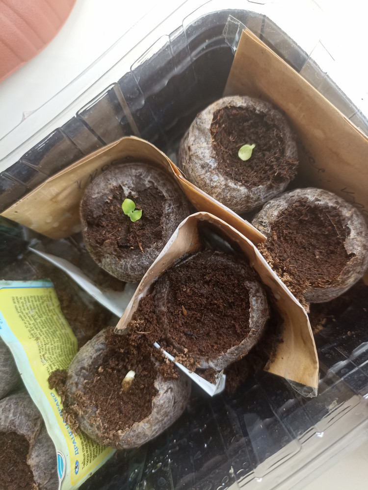 Посеяла недели две назад - поверхностно, думала, что не прорастут уже, а сегодня все три семени проклюнулись и даже за ночь в земельку укоренились. Всхожесть 100%.