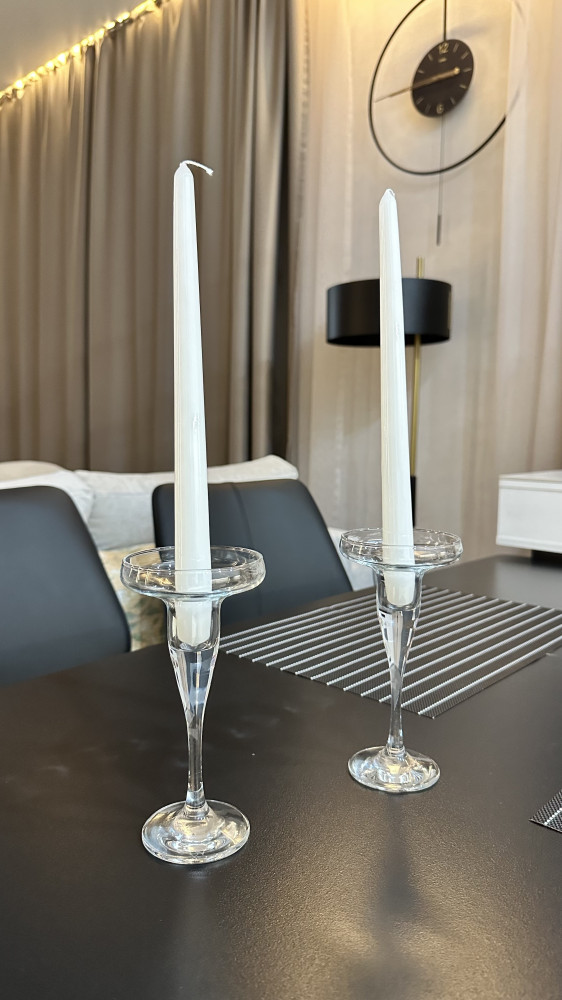 Подсвечники очень понравились. На вид кажутся хрупкими, но это не так, прочное стекло, качественное, без сколов, без пузырьков. Мне нравится, что они довольно высокие. Подсвечники устойчивые, углубление удобное, свечи устанавливаются накрепко. Собственно давно такие хотела и ждала, когда они появятся на складе в Алматы. Спасибо за качественное обслуживание, подсвечники прибыли тщательно упакованные в пупырчатую плёнку, все привезли в целости и сохранности. Жаль, что подсвечники без упаковки, купила бы в подарок подругам. Приобрела и себе, и дочери, обе довольны. Кстати, прочитала, что попались с разной длиной углублений, нам повезло все четыре подсвечника идеальны.