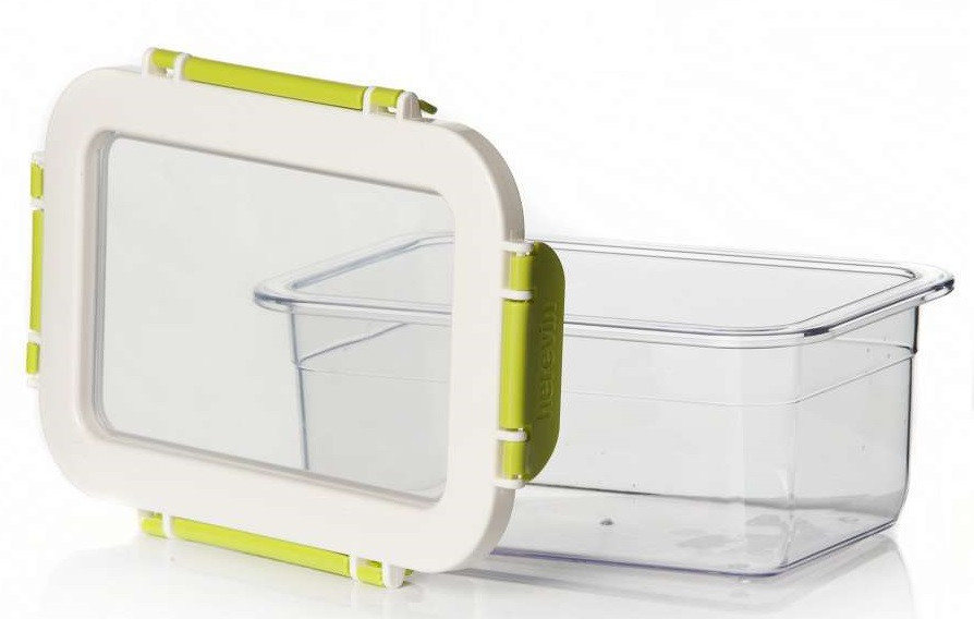Пластик контейнера не мягкий, не эластичный. Первое впечатление, если упадет, то обязательно треснет. Без запаха. Крышка закрывается плотно. Крышка состоит из двух частей: белой рамки с зажимами и прозрачного окошка. Можно легко помыть части.