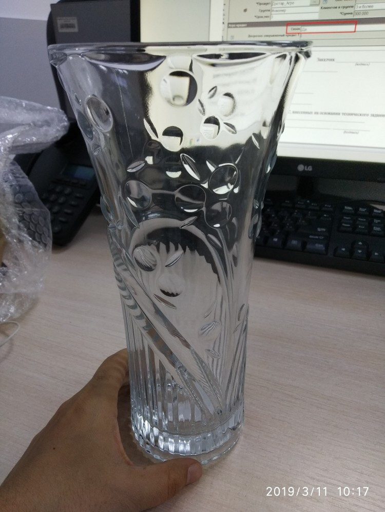 Упакован отлично, ваза тяжелая, как я и хотела, можно большой букет ставить, красивая с узорами, и цена со скидкой приемлемая, довольна покупкой, думаю еще заказать, спасибо флип!