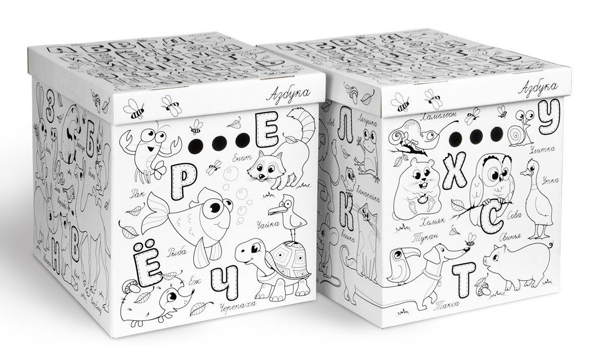 Очень нужная вещь. Картон прочный. Короб вместительный. Для детских игрушек или для хранения шерстяных вещей и т.д. Собирается на раз-два. В упаковке 2 штуки. Дети могут раскрашивать, попутно изучая алфавит.