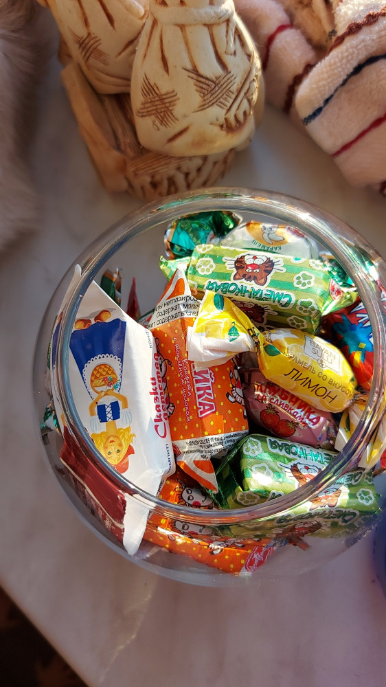 Вазочка очень вписалась в интерьер. Я представляла её меньшего размера, но, оказалось, она годится не только для конфет, но и маленький букетик будет в ней неплохо смотреться. Возьму ещё себе и в подарок.
