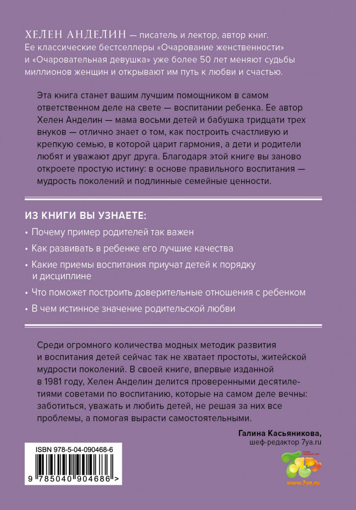 Все о детях. Секреты воспитания от мамы 8 детей и бабушки 33 внуковВ данный момент этот товар отсутствует в продаже. Возможно, у нас найдется аналогичный или похожий товар здесь. Серия: Лучшее от Хелен Анделин. Книги-бестселлеры о женственности В книге рассказывается о том, как воспитать хороших и послушных детей, которые в будущем станут гордостью и опорой для своих родителей. Какими должны быть сами родители, как приучить детей к порядку, как помочь им стать уверенными в себе, добрыми, честными и преуспевающими в жизни — Хелен Анделин отвечает на самые важные вопросы в жизни родителей. А главное — вы узнаете, как создать крепкую семью, уютный дом, в котором царят любовь, взаимопонимание и счастье. |