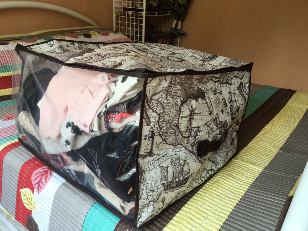 Он оказался очень большой! Сложив туда все вещи, он у меня занял практически всю полку в шкафу. Зато, туда вместилось все))))