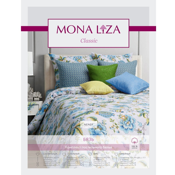 Комплекты постельного белья выполнены из импортной бязи высокого качества, произведенной на современном оборудовании с использованием стойких и безопасных красителей. Ткань полотняного переплетения с незначительной сминаемостью, хорошо сохраняющая цвет при стирке, легкая, с прекрасными гигиеническими показателями. Самая широкая линейка дизайнов в торговой марке "Mona Liza" - для любого стилевого и цветового решения интерьера.