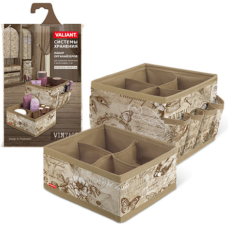 В данный момент этот товар отсутствует в продаже. Возможно, у нас найдется аналогичный или похожий товар здесь. Серия: Vintage Набор Valiant включает 2 органайзера для хранения косметики и аксессуаров. Изделия выполнены из высококачественного нетканого материала (спанбонда), который обеспечивает естественную вентиляцию, позволяя воздуху проникать внутрь, не пропуская пыль.