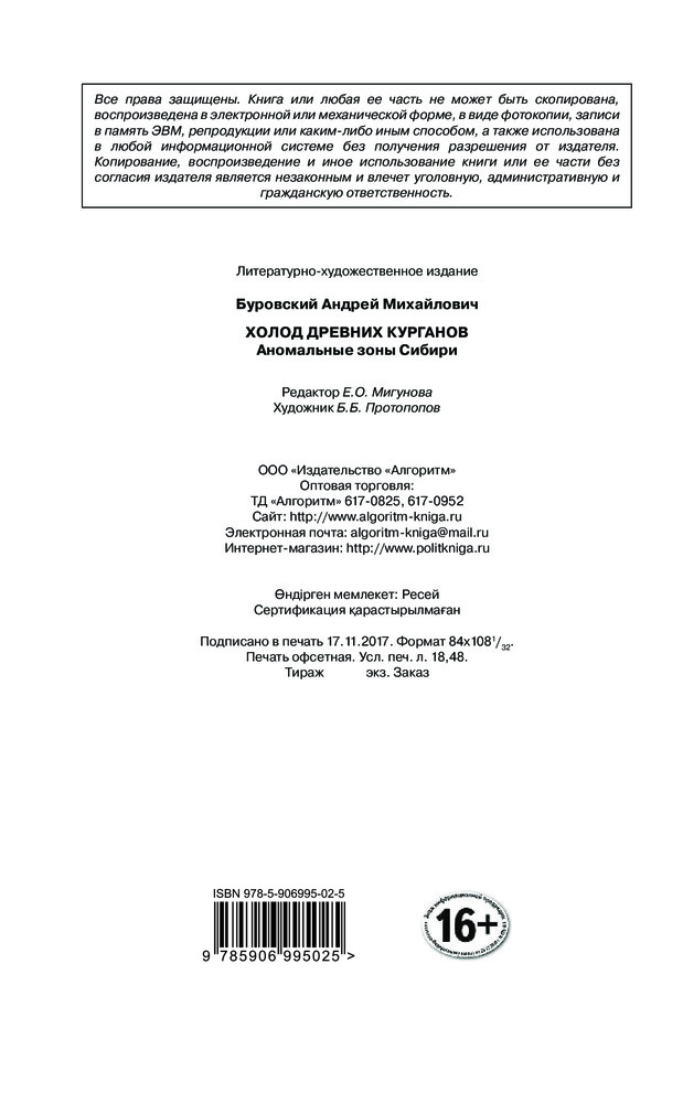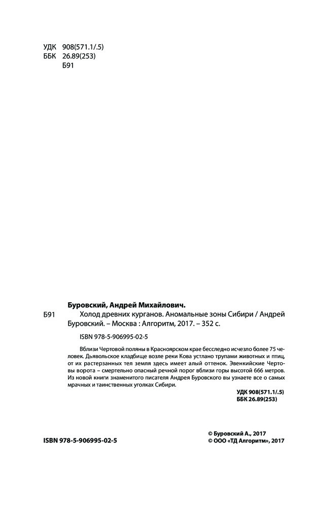 Холод древних курганов. Аномальные зоны СибириВ данный момент этот товар отсутствует в продаже. Возможно, у нас найдется аналогичный или похожий товар здесь. Серия: Таинственная Россия Вблизи Чертовой поляны в Красноярском крае бесследно исчезло более 75 человек. Дьявольское кладбище возле реки Кова устлано трупами животных и птиц, от их растерзанных тел земля здесь имеет алый оттенок. Эвенкийские Чертовы ворота — смертельно опасный речной порог вблизи горы высотой 666 метров. Из новой книги знаменитого писателя Андрея Буровского вы узнаете все о самых мрачных и таинственных уголках Сибири. |