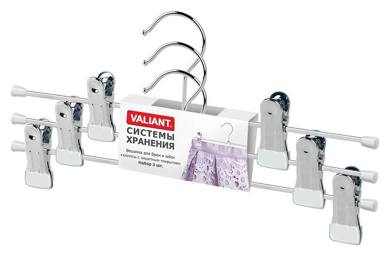 В данный момент этот товар отсутствует в продаже. Возможно, у нас найдется аналогичный или похожий товар здесь. Серия: Black&White Набор удобных вешалок для брюк и юбок. Простая и функциональная конструкция. Клипсы с защитным покрытием. VALIANT - особенный комфорт для Ваших вещей!