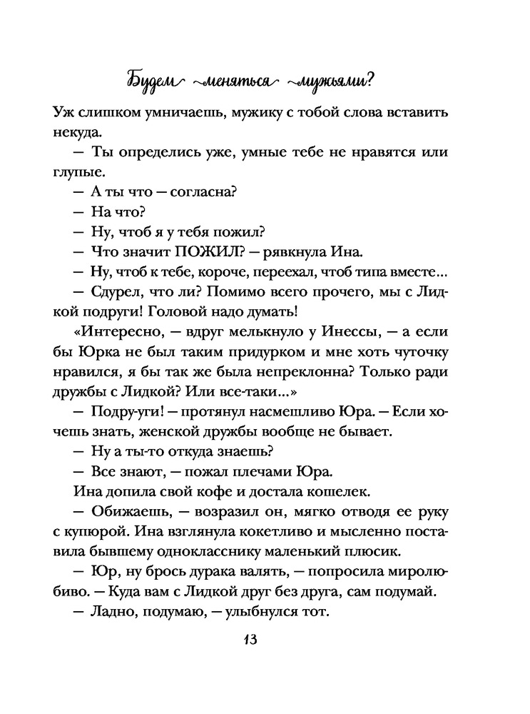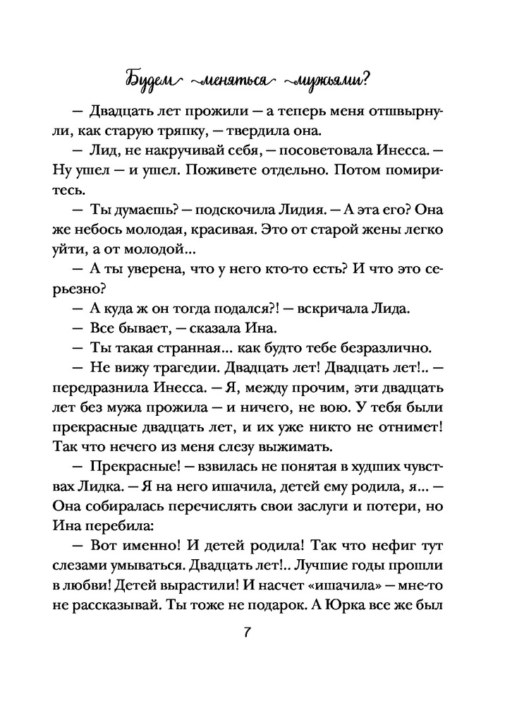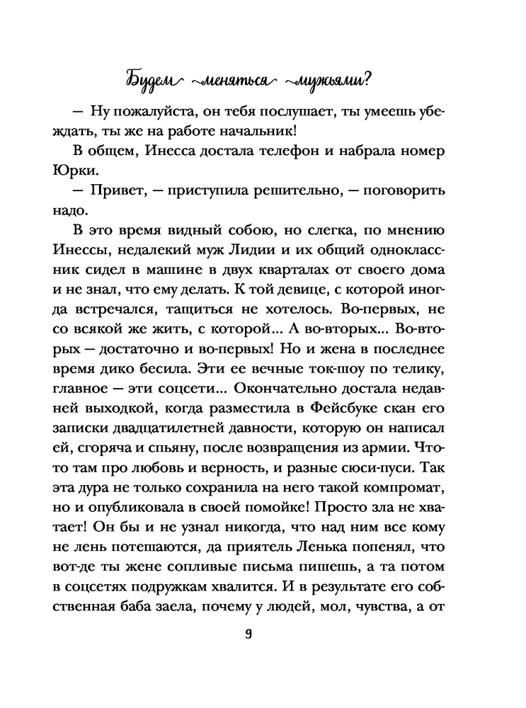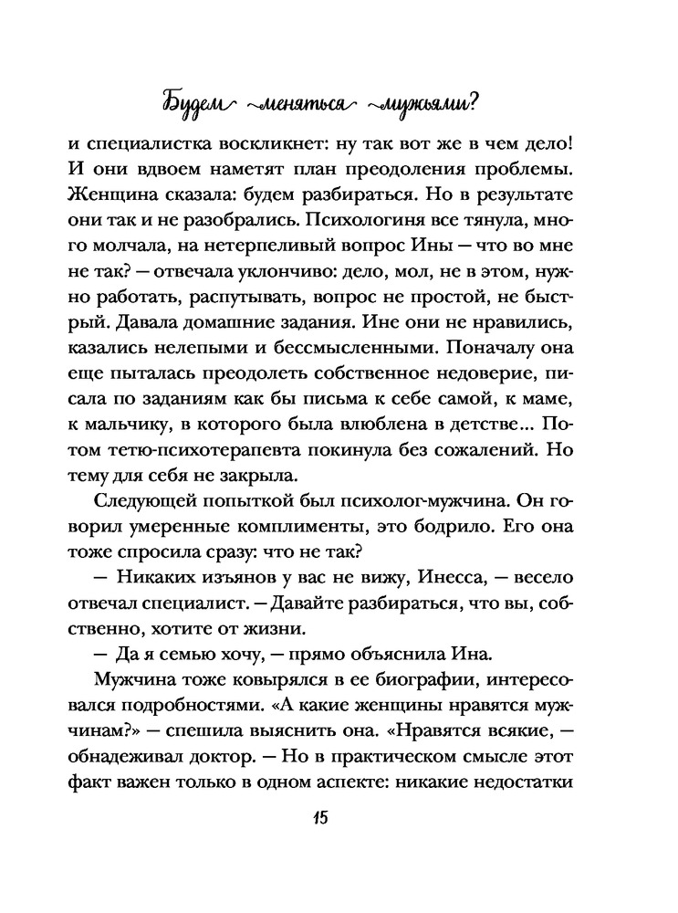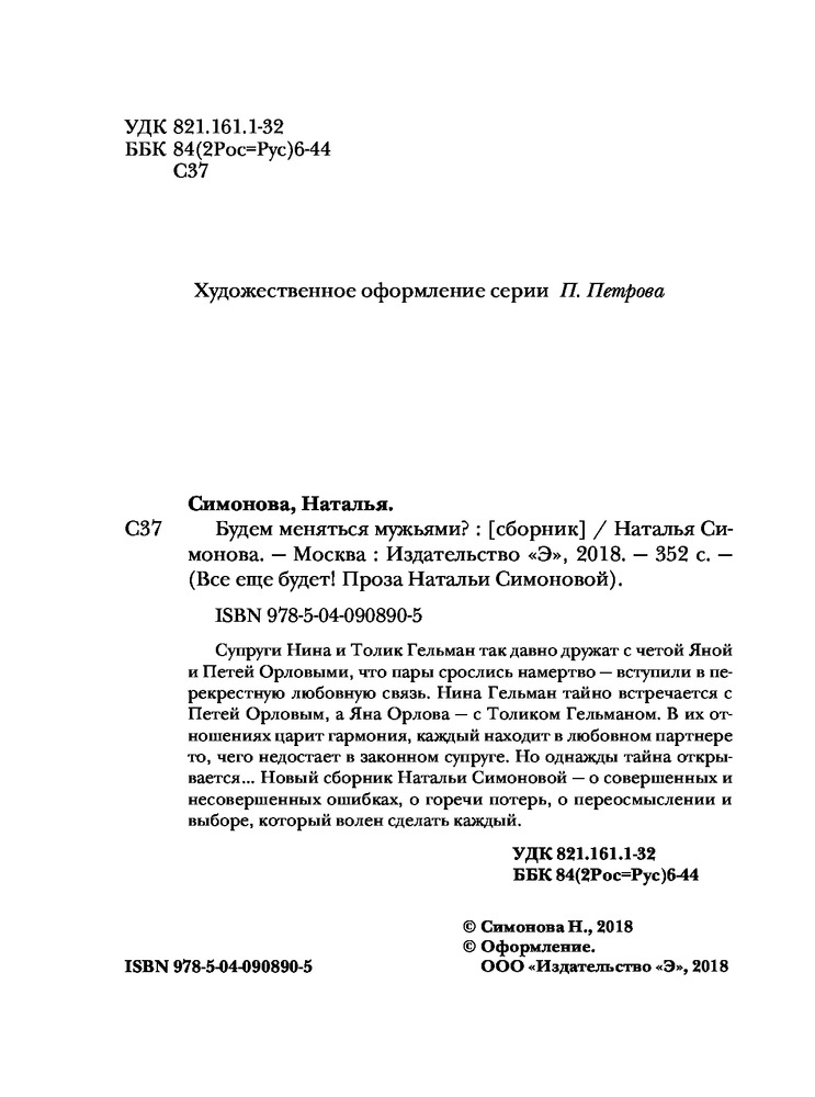 Будем меняться мужьями?В данный момент этот товар отсутствует в продаже. Возможно, у нас найдется аналогичный или похожий товар здесь. Серия: Все еще будет! Супруги Нина и Толик Гельман так давно дружат с четой Яной и Петей Орловыми, что пары срослись намертво — вступили в перекрестную любовную связь. Нина Гельман тайно встречается с Петей Орловым, а Яна Орлова — с Толиком Гельманом. В их отношениях царит гармония, каждый находит в любовном партнере то, чего недостает в законном супруге. Но однажды тайна открывается... Новый сборник Натальи Симоновой — о совершенных и несовершенных ошибках, о горечи потерь, о переосмыслении и выборе, который волен сделать каждый. |