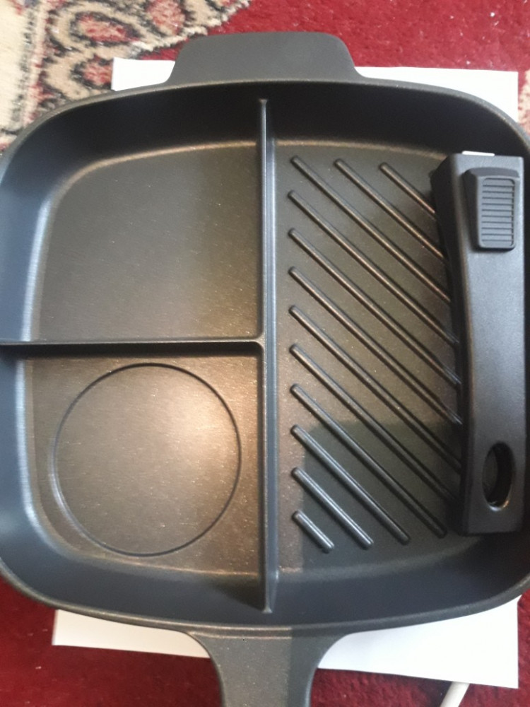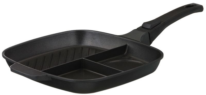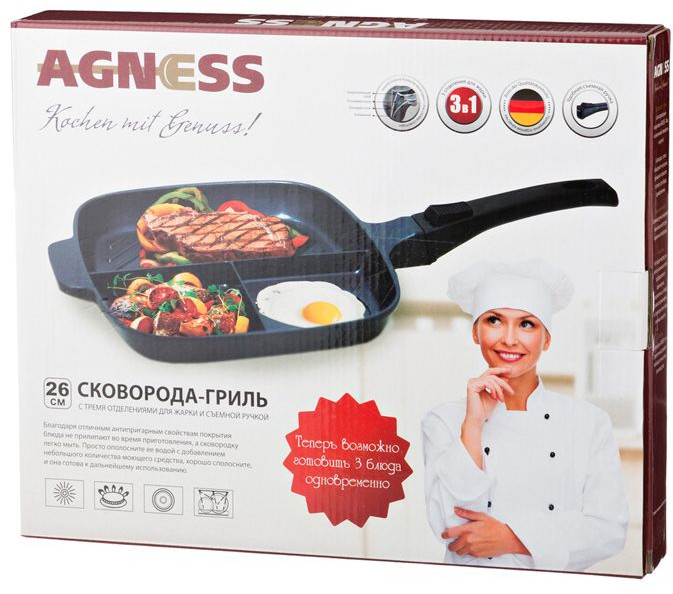 Agness Сковорода-гриль с 3-мя отделениямиВ данный момент этот товар отсутствует в продаже. Возможно, у нас найдется аналогичный или похожий товар здесь. Особенность данной чудо сковородки в том, что ее рабочая площадь спроектирована так, чтобы предоставить возможность пользователю жарить до пяти разных ингредиентов, не смешивая их. Один из трех отсеков сковороды имеет ребристую поверхность для жарки на гриле. Сковородка выполнена из кованого алюминия c очень высокой теплопроводностью. Эргономичная съемная ручка, приятная на ощупь и не нагревающаяся в процессе приготовления пищи. Изделие можно мыть в посудомойке; подходить для на любой варочной поверхности. |