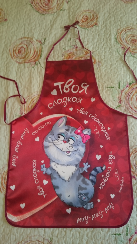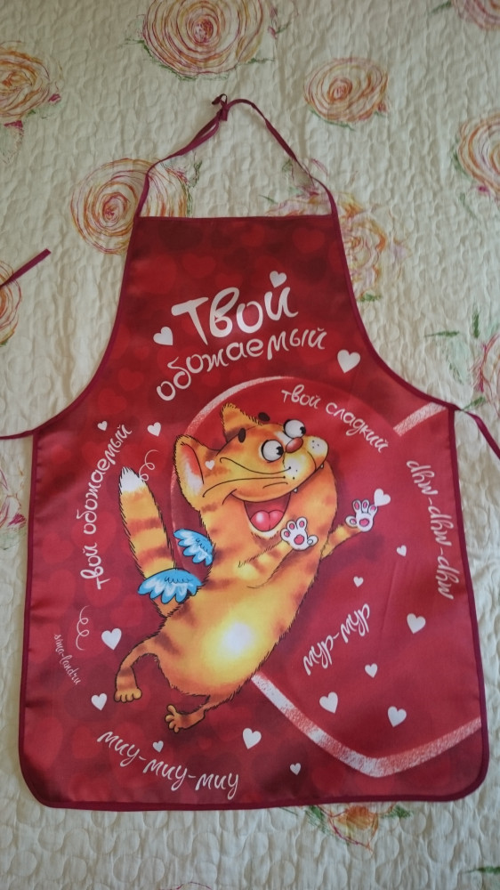 Хорошие качественные фартучки, ткань средней плотности блестит, как атлас. Яркий насыщенный цвет. Весёлые котики поднимают настроение!