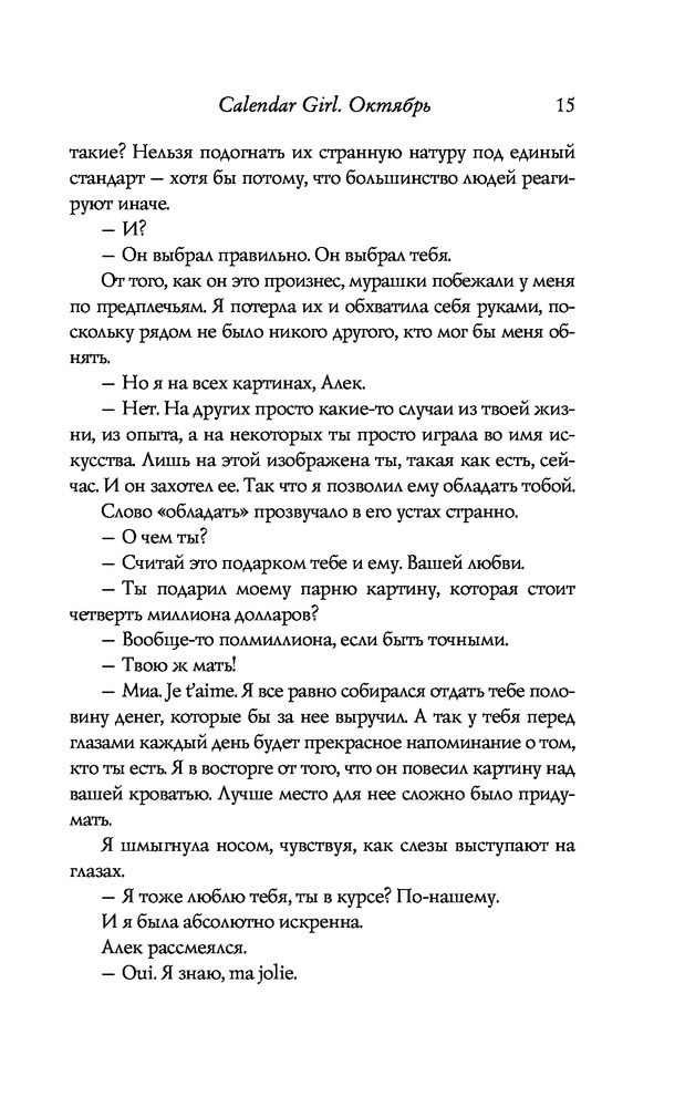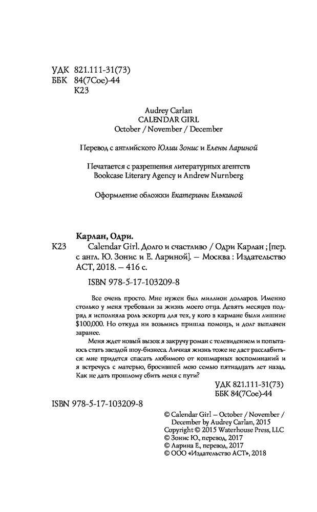 Calendar Girl. Долго и счастливоВ данный момент этот товар отсутствует в продаже. Возможно, у нас найдется аналогичный или похожий товар здесь. Все очень просто. Мне нужен был миллион долларов. Именно столько у меня требовали за жизнь моего отца. Девять месяцев подряд я исполняла роль эскорта для тех, у кого в кармане были лишние $100 000. Но откуда ни возьмись пришла помощь, и долг выплачен заранее. |