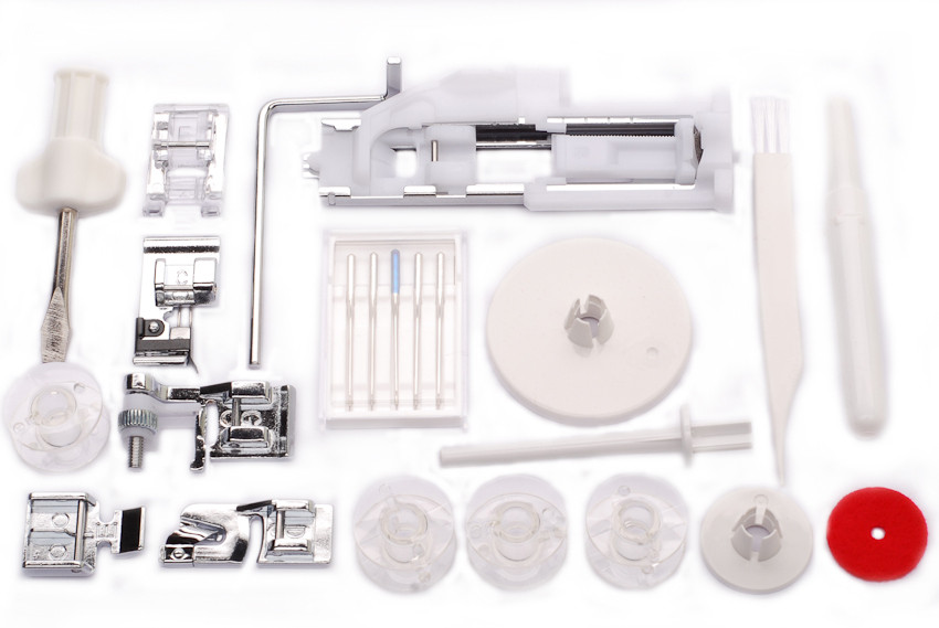 Стандартные принадлежности: лапка стандартная A, лапка для втачивания молнии Е, рамка для автоматического выполнения петли R, оверлочная лапка C, лапка для потайного шва G, лапка для петли B, лапка подрубатель D, направитель ткани, шпульки 5 шт. (4 шт. и 1 в машине), набор игл 5 шт., вспарыватель, большая отвёртка, щеточка от пыли, дополнительный катушечный стержень, держатель для катушки большой, держатель для катушки малый, фетровая прокладка под катушку, жесткий чехол.