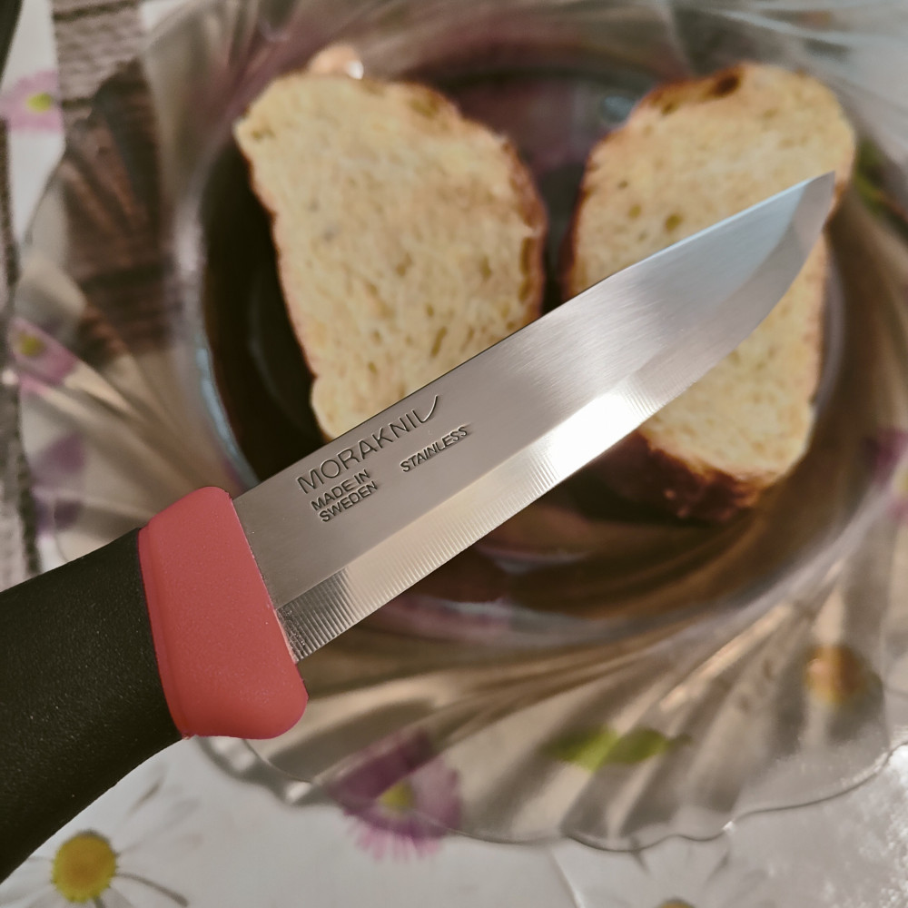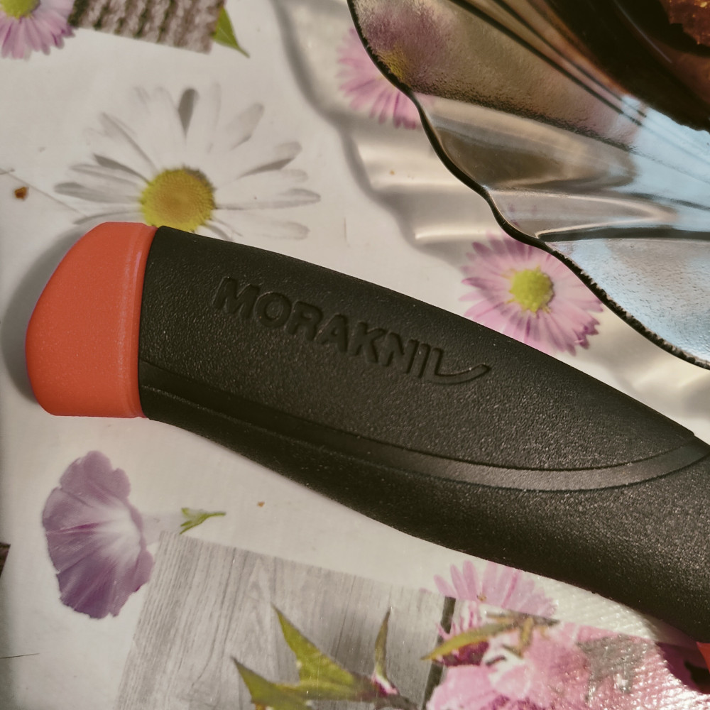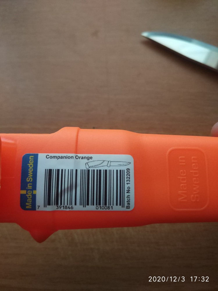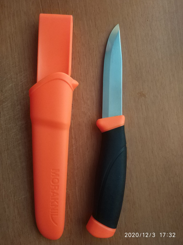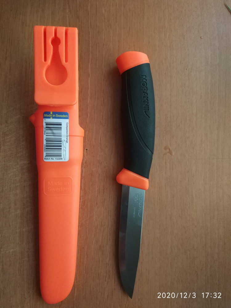 Нож отличный, оригинальный. НЕ подделка, НЕ китайский, логотипы указаны все верно, ножны правильные. Нож очень острый, заводская заточка на высоте. Скандинавские спуски, нержавейка сандвик. Есть в этой линейке ножей Companion и углеродная сталь Carbon, но она ржавеет, поэтому выбор пал именно на эту модель. Ручка огонь! Прорезиненная поверхность не даёт скользить руке. Ярко-оранжевый цвет поможет не потерять этот нож. Брал как универсальный на природу, на отдых, на рыбалку.