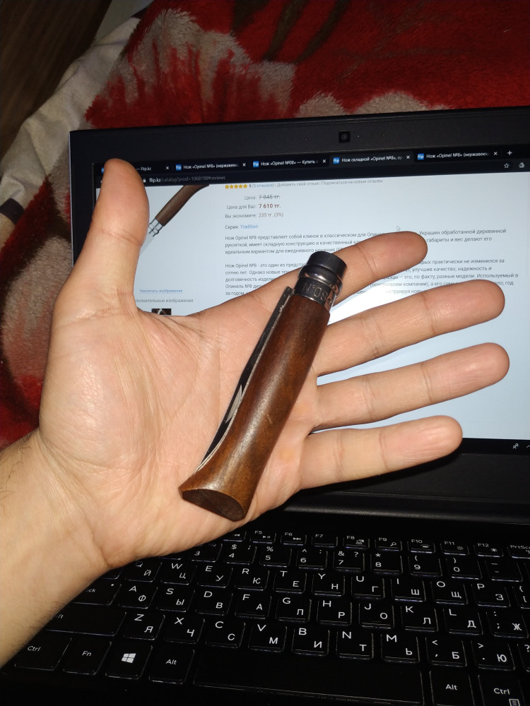 Нож понравился. Качественно сделан. Заточку, если кому то показалось что чуть-чуть бы иметь получше, можно подправить на плашке с кожей или на керамике. Жалею, что в магазине не продается этот нож с ореховой рукоятью 9-го размера. Было бы вообще супер. При пропитке льняным маслом ореховая рукоять требует дольше времени в два раза чем с буком. Последние пузырьки воздуха выходили еще после 2,5 часа пропитки, что удивительно. И последнее, пожелание для производителя - Было бы красивее, если б с помощью лазерной гравировке на ручке было нанесено название ножа так же как на буке. Но на буке это покраска, а для ореха подошла бы лазерная гравировка, так как цвет темнее чем бук. Рекомендую к покупке тому, кто любит ножи OPINEL.