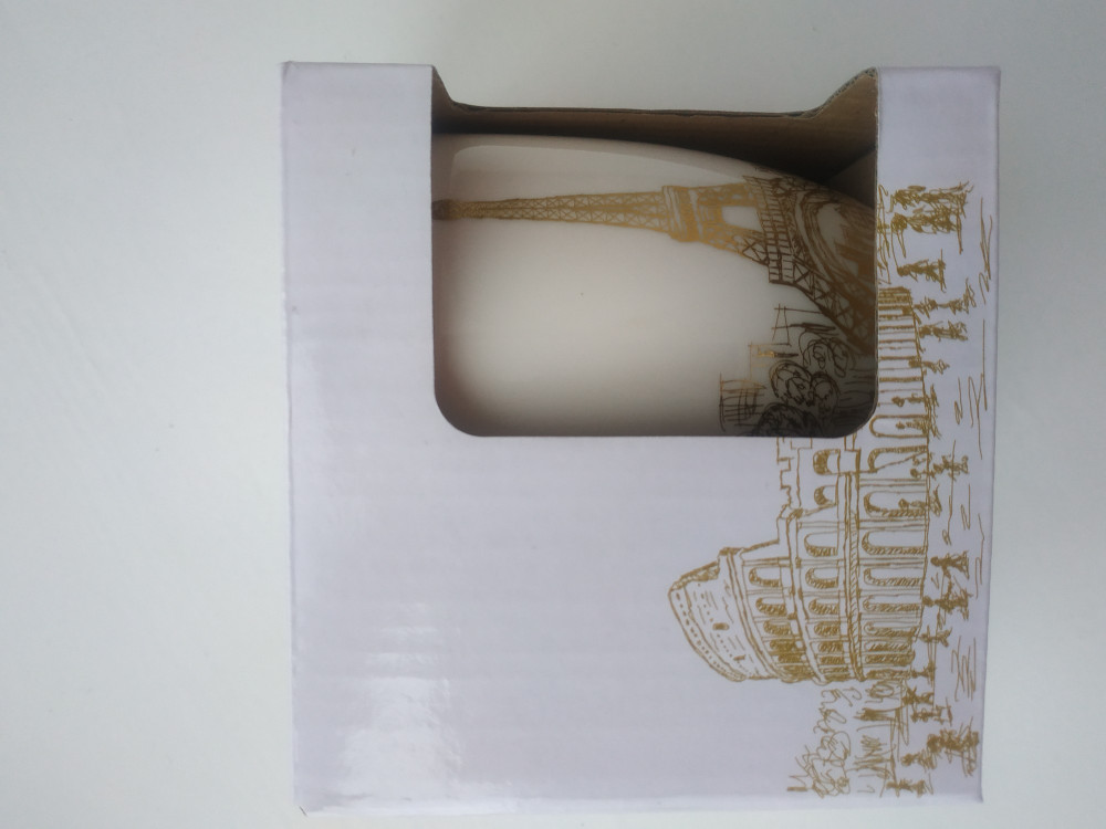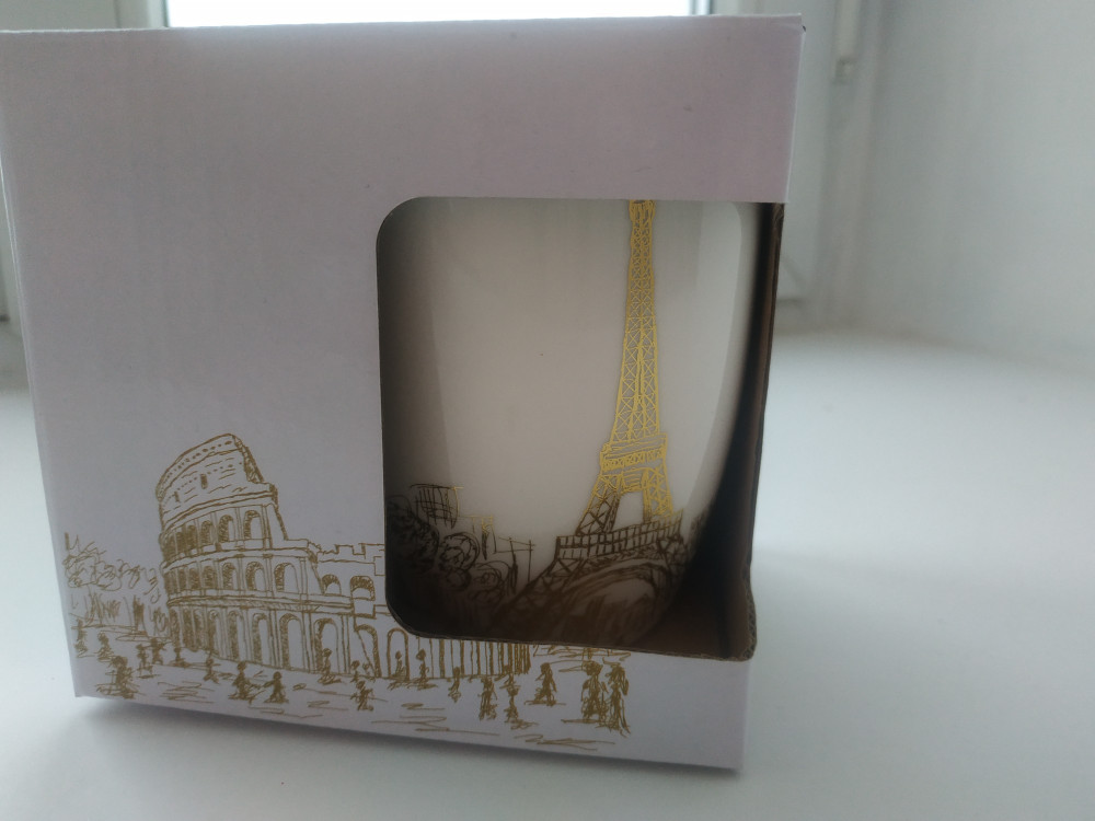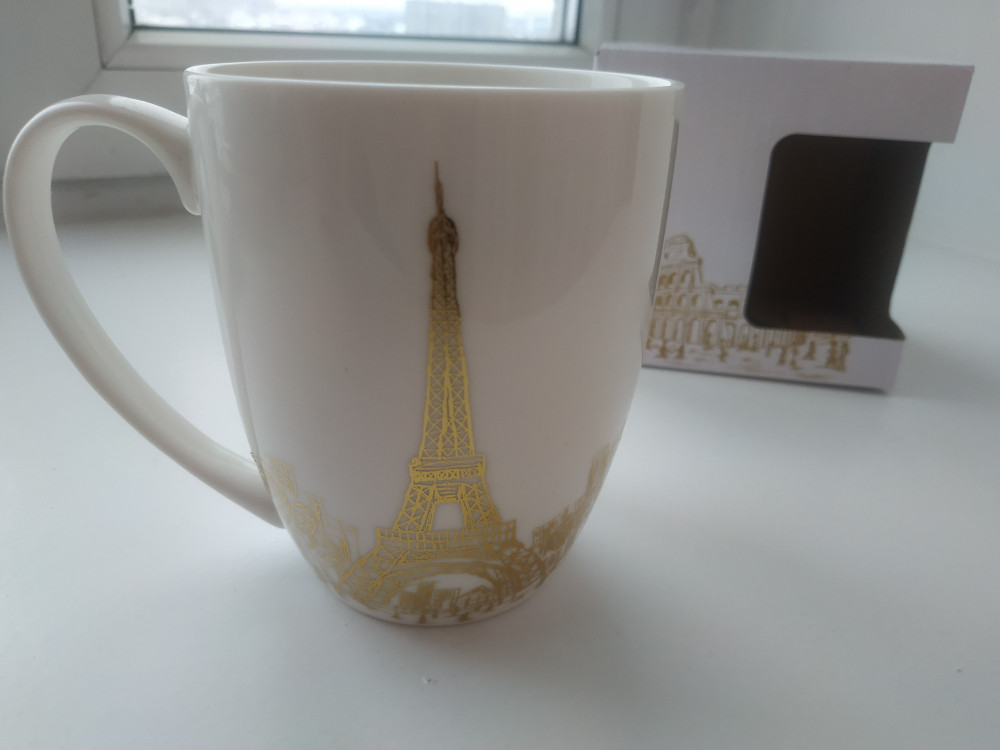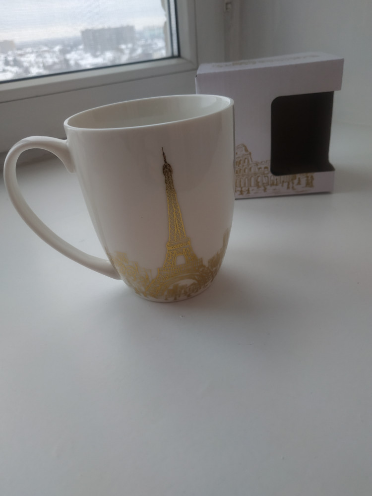 Кружка красивая, молочного цвета, с золотым рисунком. Мне очень нравится. Спасибо.