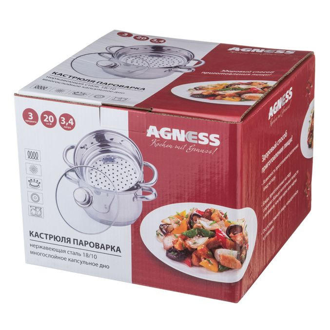 Agness Кастрюля с пароваркой-30% +415 нержавеющая сталь вставка-пароварка подходящий объём крышка не прилегает