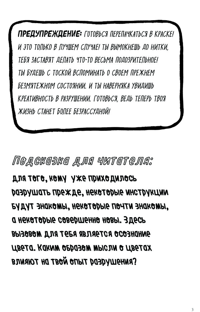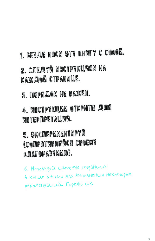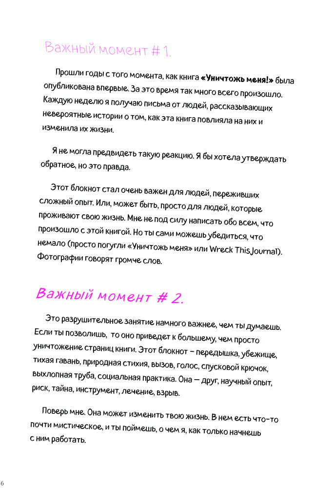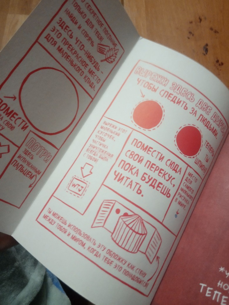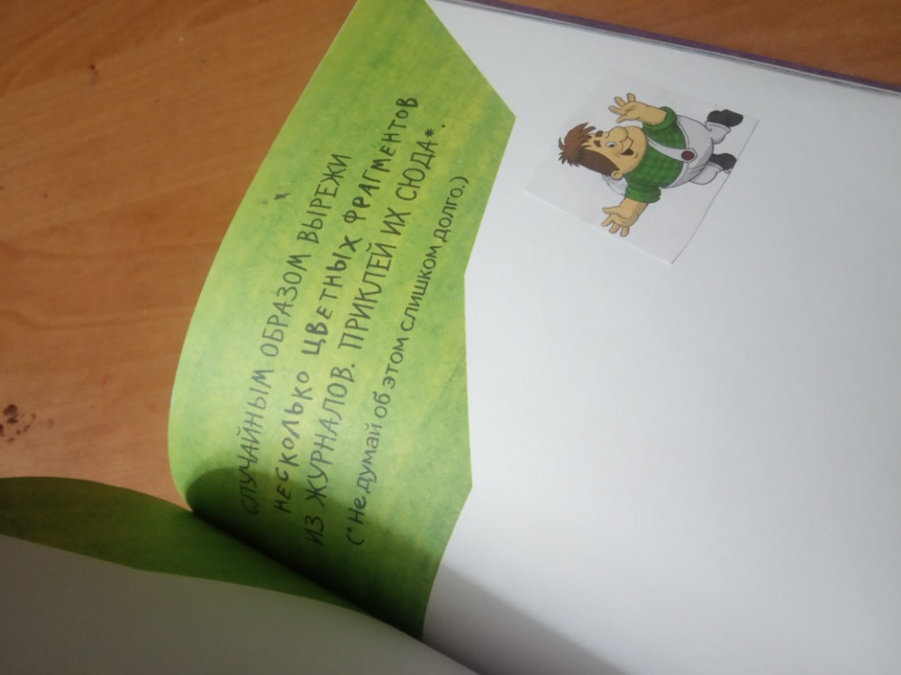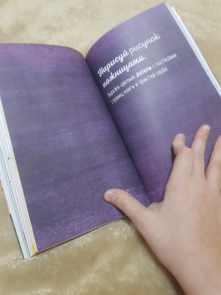 Заказ пришел очень быстро, за 3 дня! Блокнот в цвете, на каждой странице задания творческого характера. Единственное, что смущает, так это задания в которых нужно сломать корешок книги, вырезать обложку и отверстия в ней и т.д. Данные задания противоречат нашему воспитанию и отношению к книгам. В инструкции написано - уничтожь этот блокнот! (Ужас) . Заказала, т.к. дочь очень хотела этот блокнот...