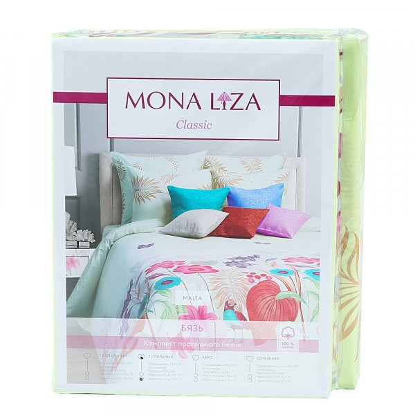 Комплекты постельного белья выполнены из импортной бязи высокого качества, произведенной на современном оборудовании с использованием стойких и безопасных красителей. Ткань полотняного переплетения с незначительной сминаемостью, хорошо сохраняющая цвет при стирке, легкая, с прекрасными гигиеническими показателями. Самая широкая линейка дизайнов в торговой марке «Mona Liza» — для любого стилевого и цветового решения интерьера.