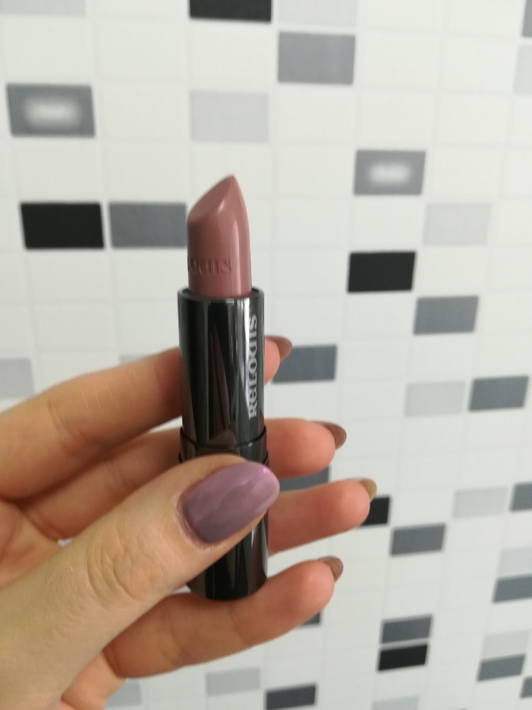 Помада кремовая, на губах смотрится и ощущается здорово. Тон 943 бледно розово-серовато-сиреневый. На фото выглядит больше розовым, на самом деле бледнее. В целом понравилась.