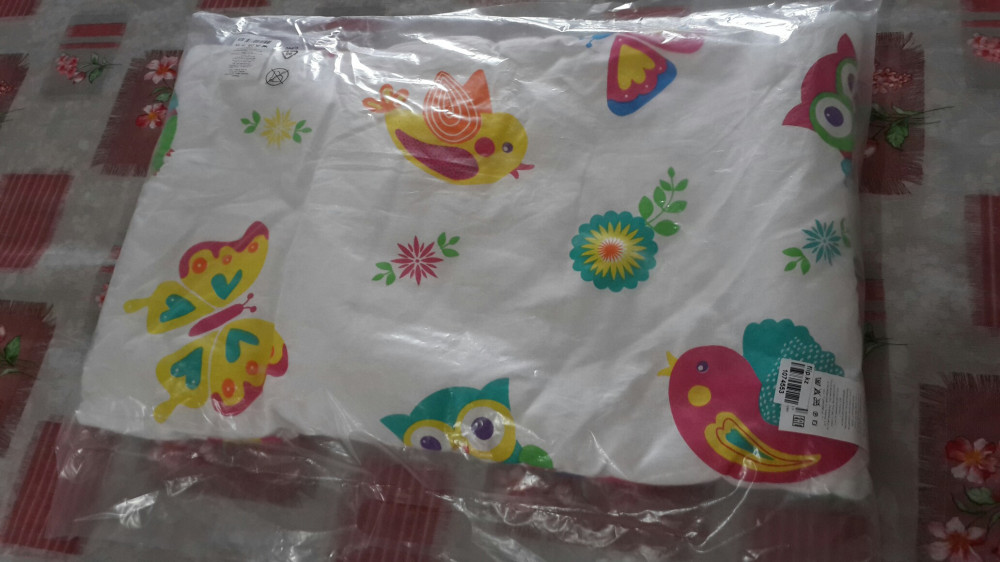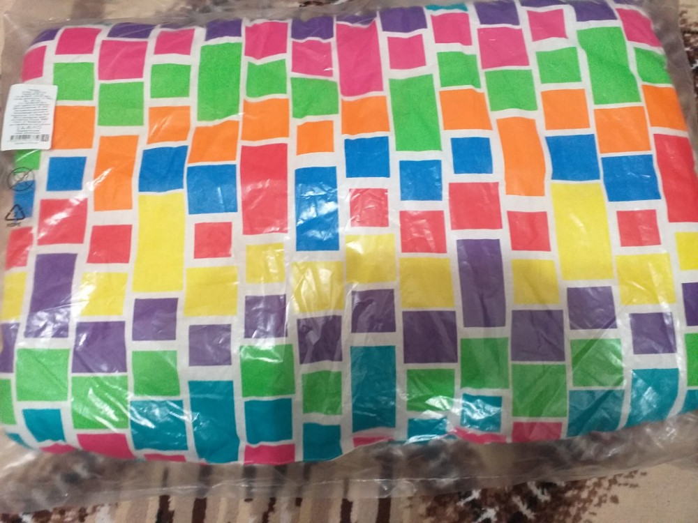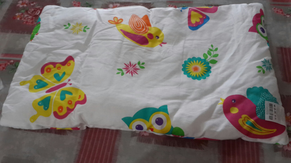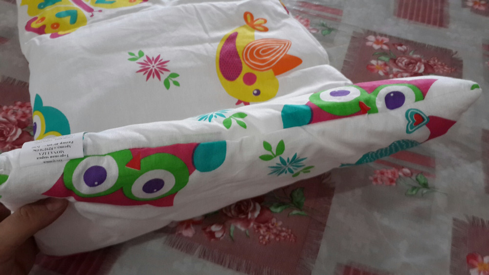 Подушка тонкая, как я и хотела ребёнку. Получила не однотонную, как заказывала, а с расцветкой яркой. Размер подбирала под комплект детский, который тоже здесь заказывала, наволочка села идеально.