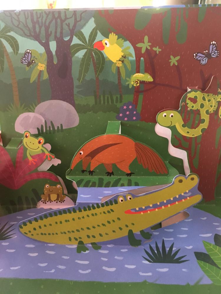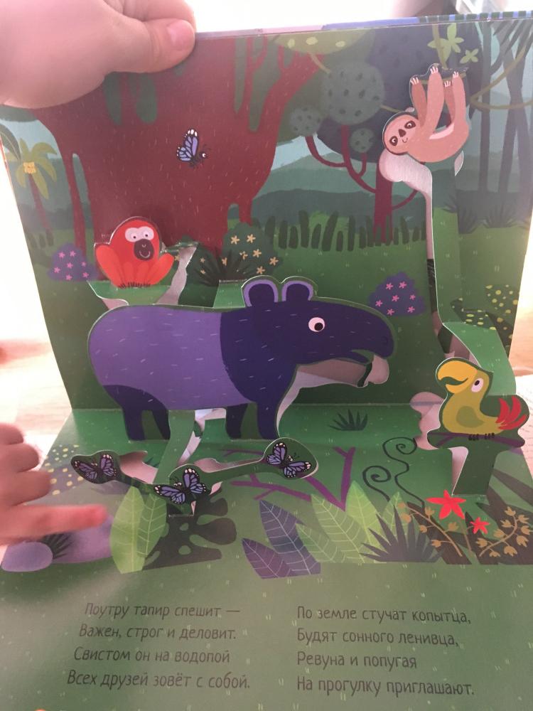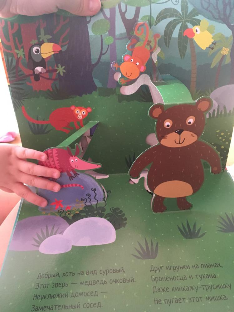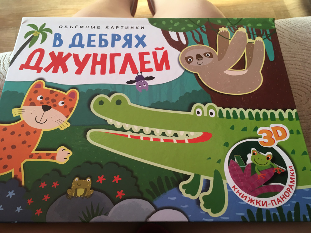 Книжка-панорамка "В дебрях джунглей" нам понравилась. Действительно, создаётся впечатление объёма. Зверюшки, хотя и есть элемент схематизации, выглядят реалистично (чего недостаёт в панорамке "На дне морском"!). Выполнена панорамка качественно, раскрывается без проблем. Отличная панорамка!