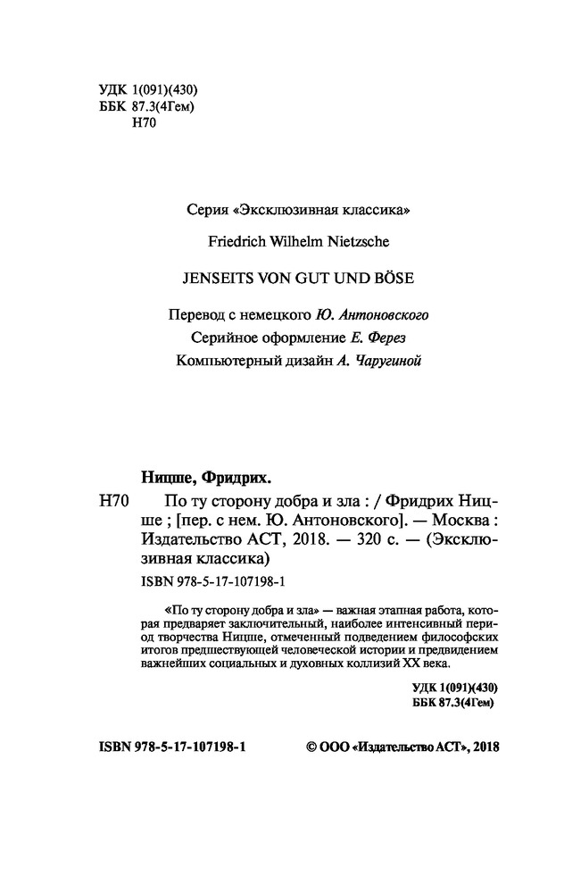 Серия: Эксклюзивная классика "По ту сторону добра и зла" — важная этапная работа, которая предваряет заключительный, наиболее интенсивный период творчества Ницше, отмеченный подведением философских итогов предшествующей человеческой истории и предвидением важнейших социальных и духовных коллизий XX века. |