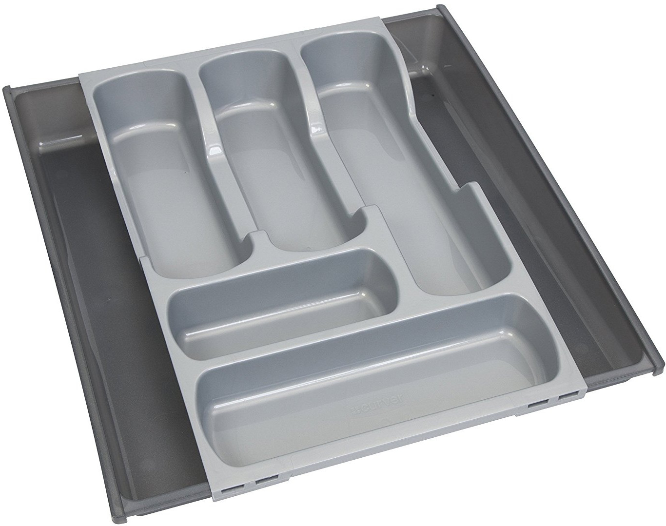 Очень вместительный, за счет того, что выдвигается по бокам - можно отрегулировать по всему пространству в ящике. Боковой пластик намного нежнее (тоньше), чем внутренний