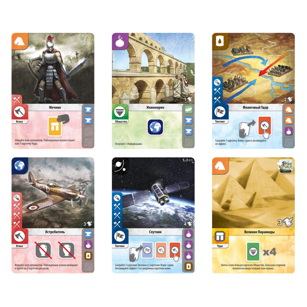 Игра очень динамичная и прекрасно сбалансирована, много силовых конфликтов, но однозначной победы военное превосходство не даёт, потому что мирные технологии дают больше победных очков, чем отнимаемые силой чудеса света. С другой стороны, военное превосходство может быть тем самым последним аргументом, что склонит чашу весов к вашей победе. Технологий много, все разные, все с адекватной ценой в ресурсах и возрастающим влиянием, так что напряжение по ходу партии только растёт. Игра быстрая, минут сорок-пятьдесят, но при этом достаточно глубокая и почти без случайностей, думать приходится над каждым ходом, везение тут не поможет. Проект очень понравился, в несколько раз оправдывает свою цену.