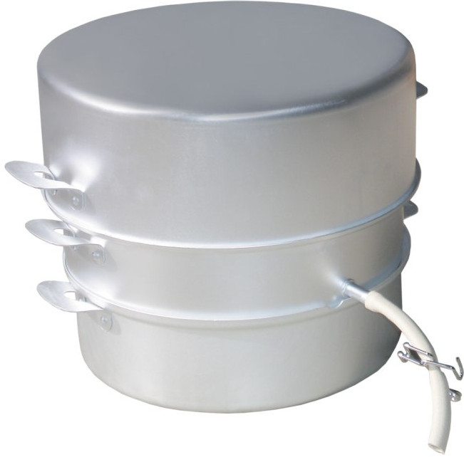 Соковарка Калитва представляет собой приспособление в виде ряда чанов, соединенных трубами. Сок из фруктов и овощей выделяется под воздействием горячего пара.