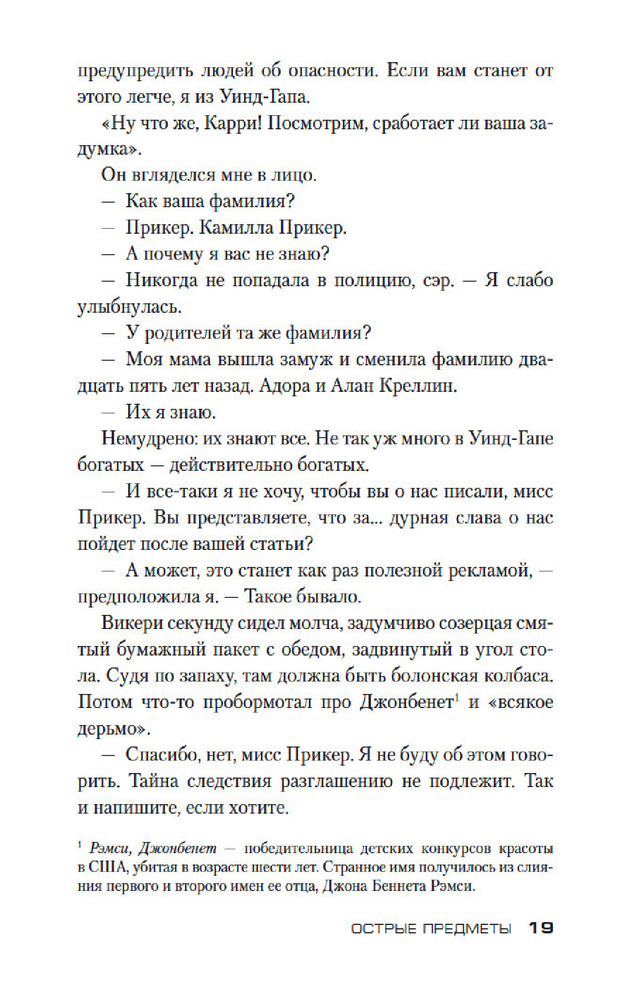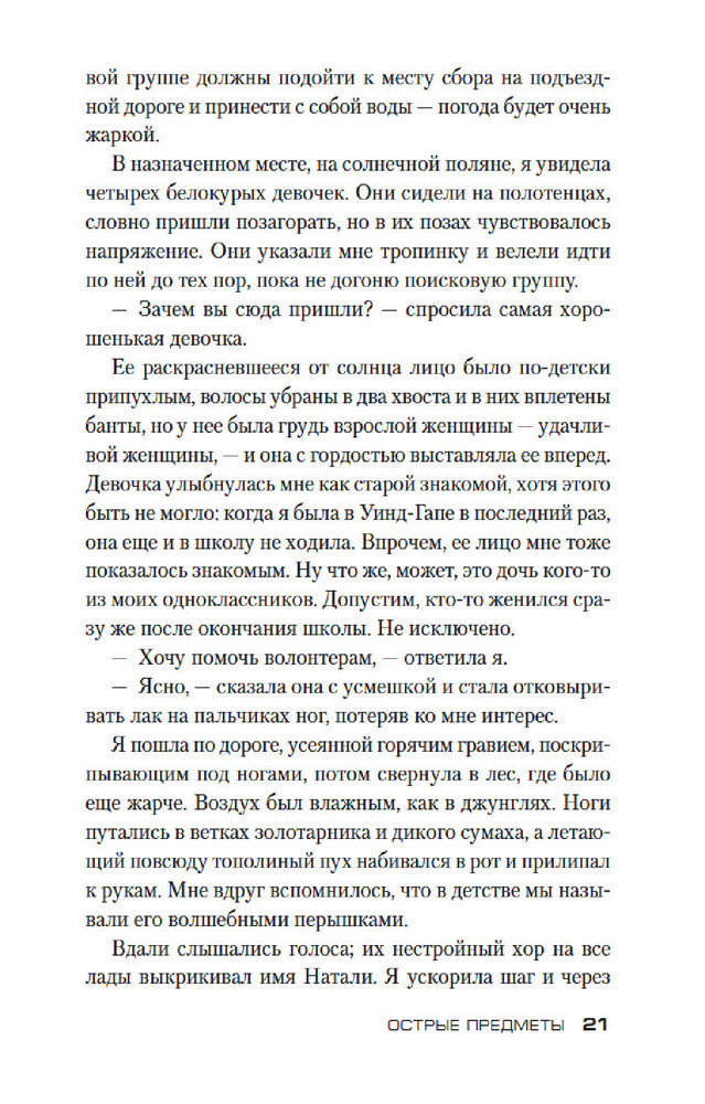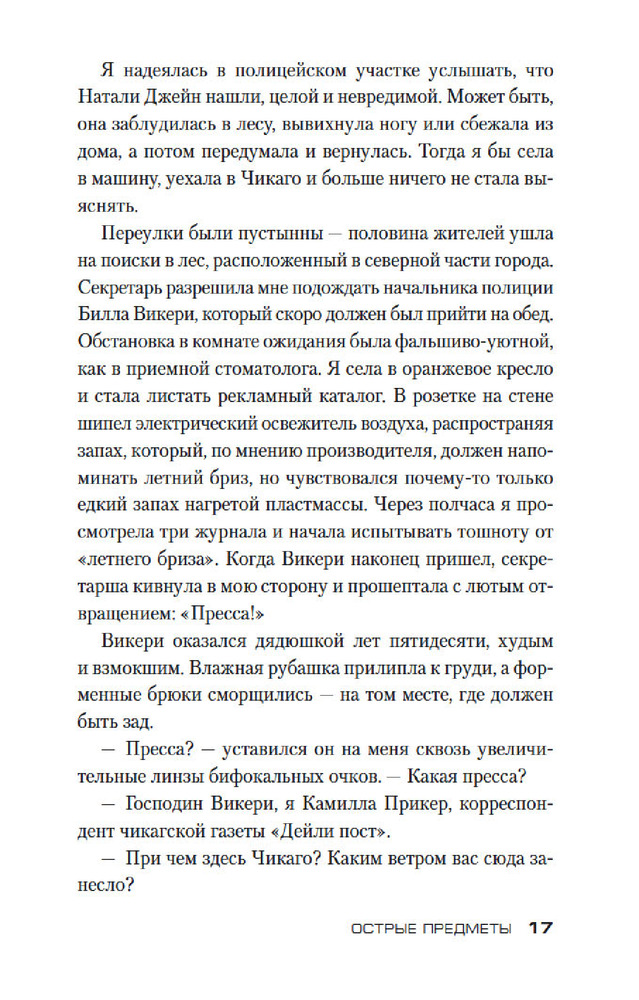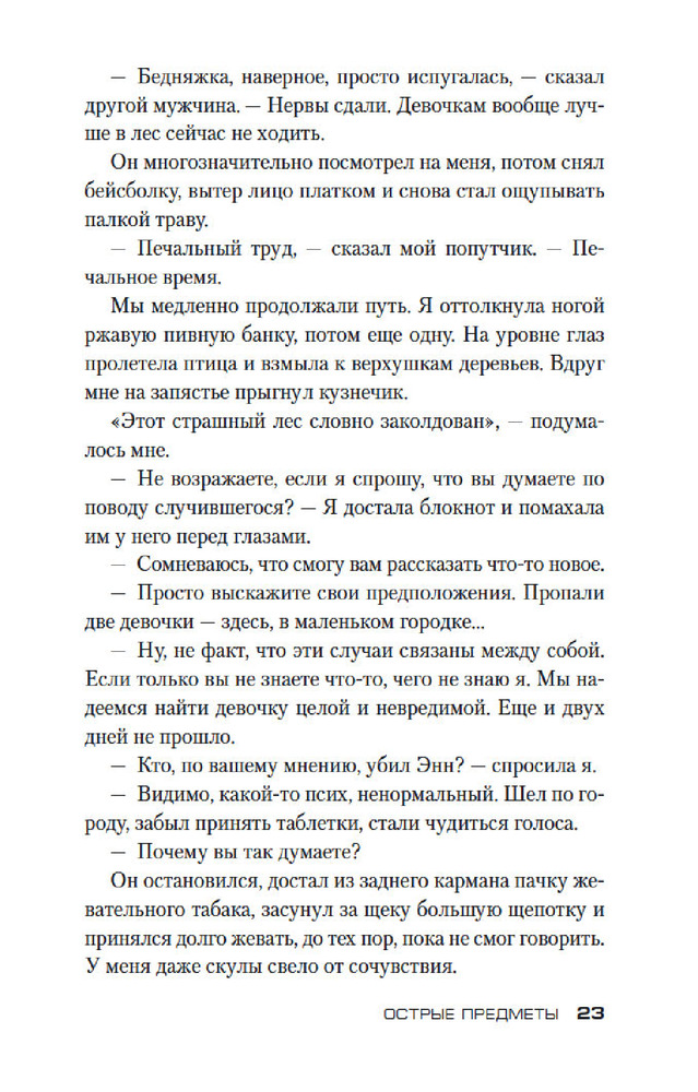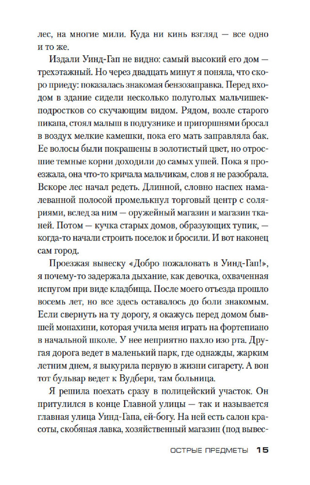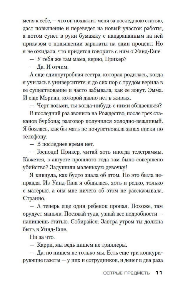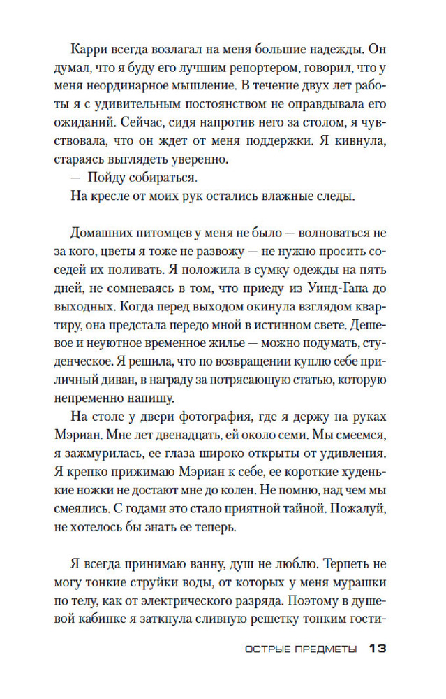 Книгу прочитала за 3 часа. Очень лёгкая. Не скажу, что она меня сильно поразила, т.к. просто американский детектив из разряда "обычного". На самом деле, книга во многом лучше ее экранизации (сериала, состоящего из 8 серий): менее нудная, более яркая и интересная. Если будет выбор между просмотром сериала и чтением книги - выбирайте второй вариант, даже если посмотрели сериал, все равно прочтите - увидите, что все намного лучше, чем на экране. Ну а если книгу уже прочли, то мой совет - ни за что не смотрите экранизацию, разочаруетесь! Говоря о повести, по качеству не уступает "острым предметам", но читать более интересно, интрига держится до самого конца, открытые финал и вопрос.