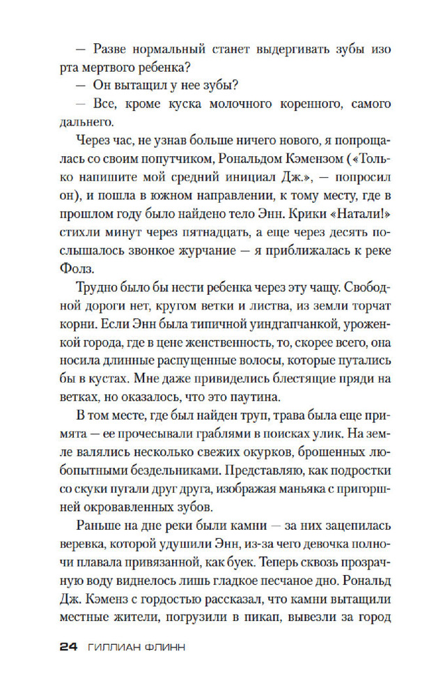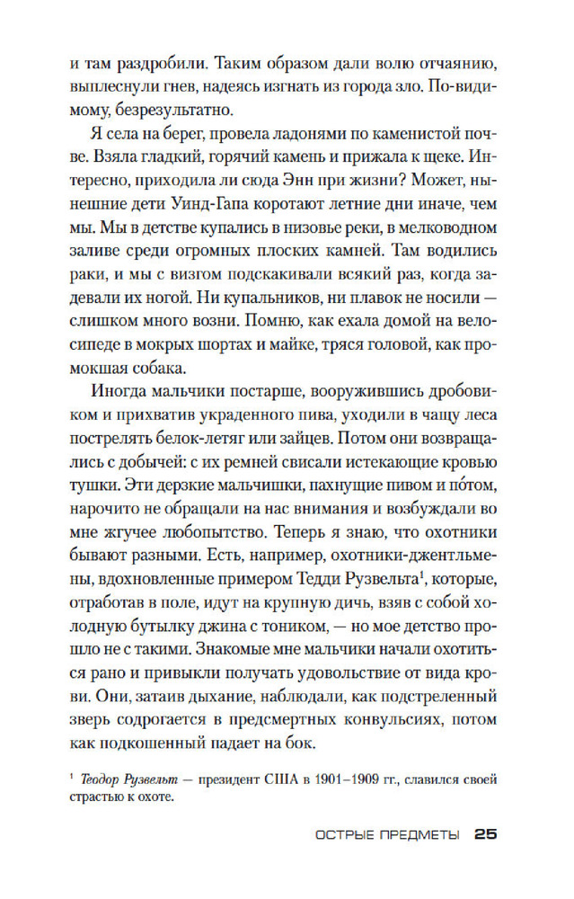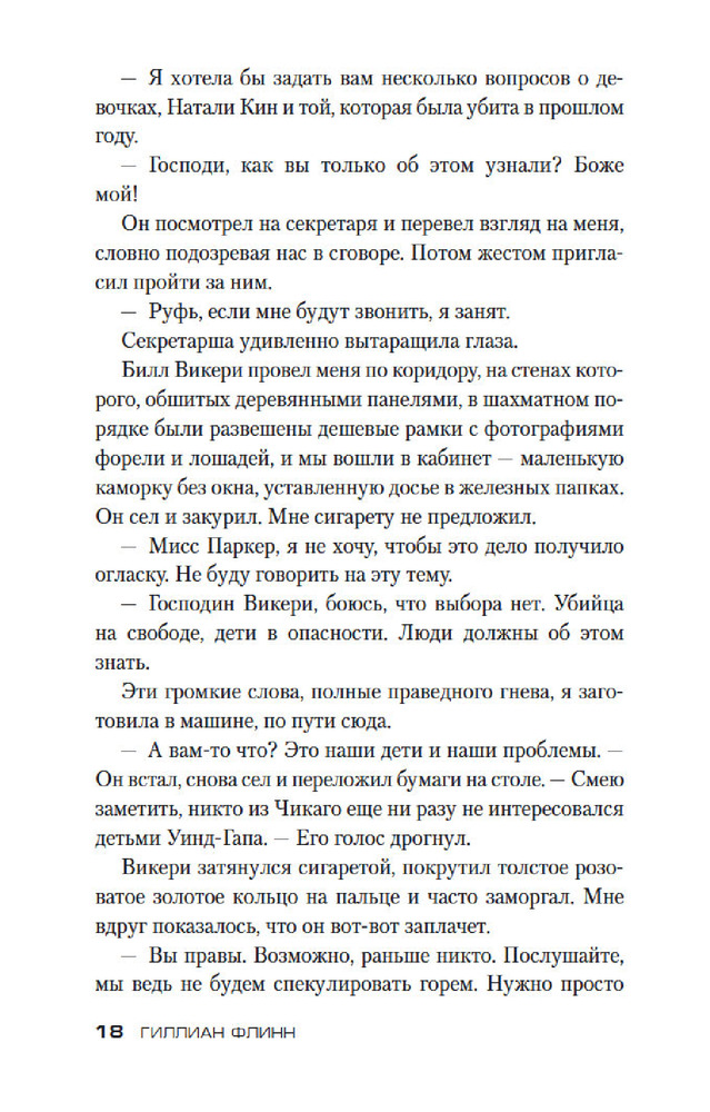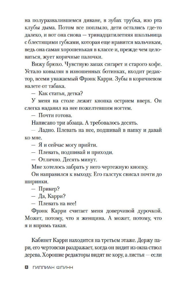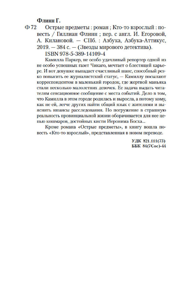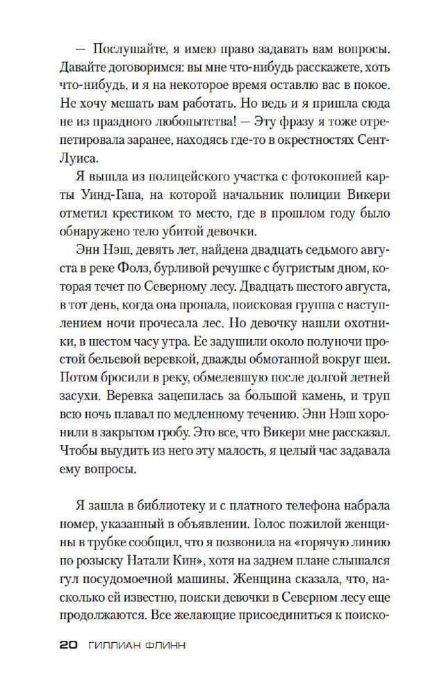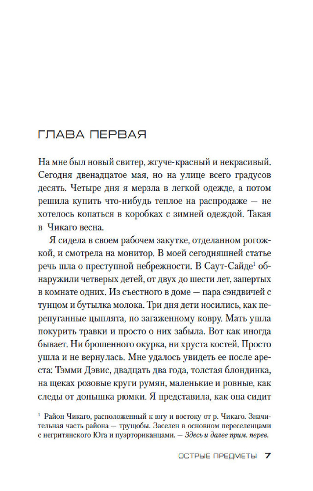 Книгу прочитала за 3 часа. Очень лёгкая. Не скажу, что она меня сильно поразила, т.к. просто американский детектив из разряда "обычного". На самом деле, книга во многом лучше ее экранизации (сериала, состоящего из 8 серий): менее нудная, более яркая и интересная. Если будет выбор между просмотром сериала и чтением книги - выбирайте второй вариант, даже если посмотрели сериал, все равно прочтите - увидите, что все намного лучше, чем на экране. Ну а если книгу уже прочли, то мой совет - ни за что не смотрите экранизацию, разочаруетесь! Говоря о повести, по качеству не уступает "острым предметам", но читать более интересно, интрига держится до самого конца, открытые финал и вопрос.