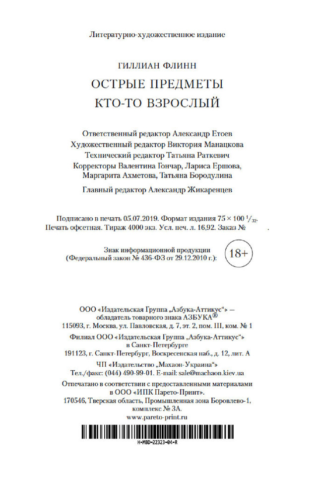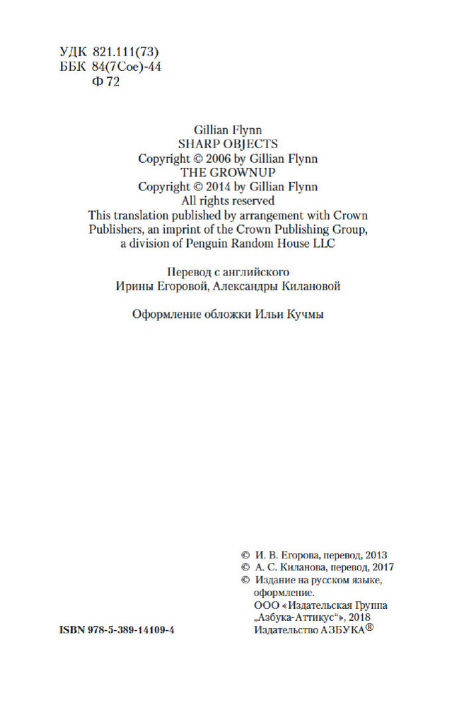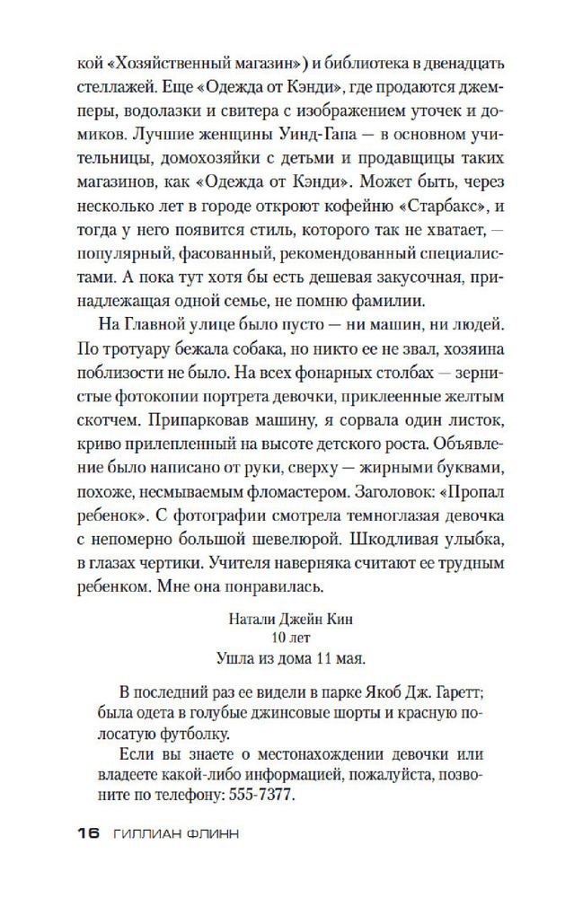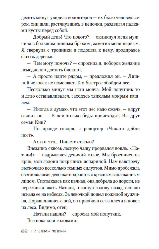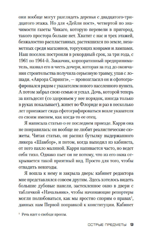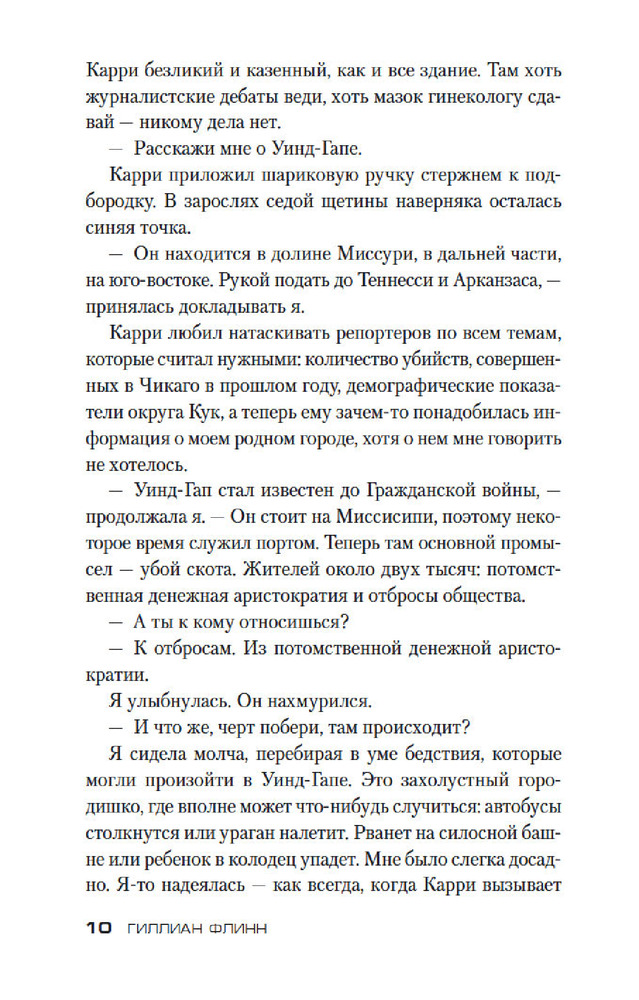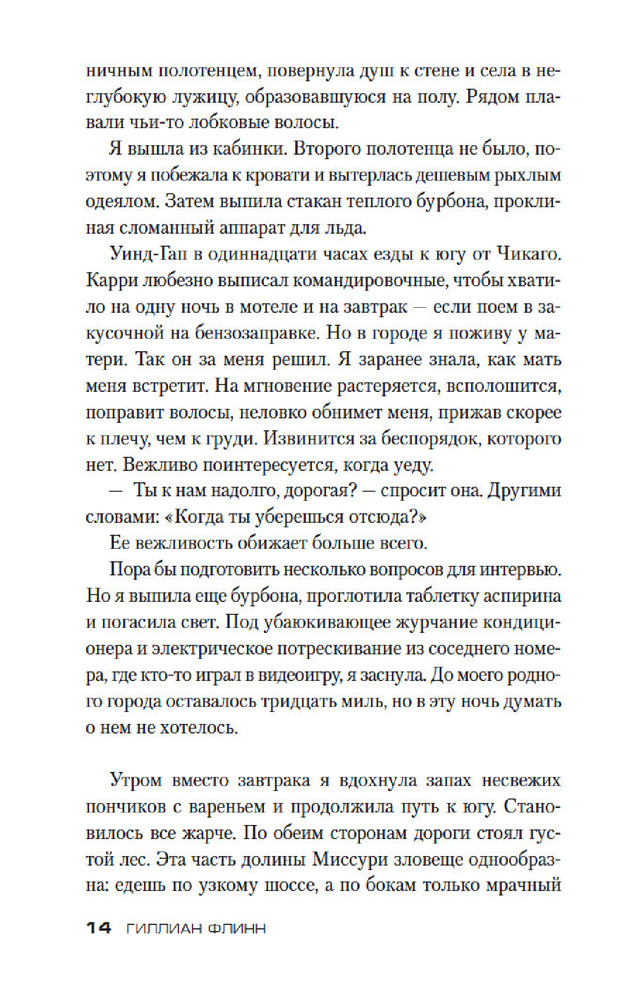 Книгу прочитала за 3 часа. Очень лёгкая. Не скажу, что она меня сильно поразила, т.к. просто американский детектив из разряда "обычного". На самом деле, книга во многом лучше ее экранизации (сериала, состоящего из 8 серий): менее нудная, более яркая и интересная. Если будет выбор между просмотром сериала и чтением книги - выбирайте второй вариант, даже если посмотрели сериал, все равно прочтите - увидите, что все намного лучше, чем на экране. Ну а если книгу уже прочли, то мой совет - ни за что не смотрите экранизацию, разочаруетесь! Говоря о повести, по качеству не уступает "острым предметам", но читать более интересно, интрига держится до самого конца, открытые финал и вопрос.