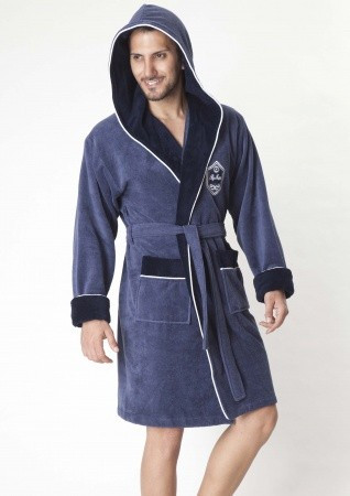 Мужской короткий халат класса Люкс. Укороченная спортивная модель с капюшоном. Отделка - комбинирование тканей, стильный кант и вышивка на груди.
