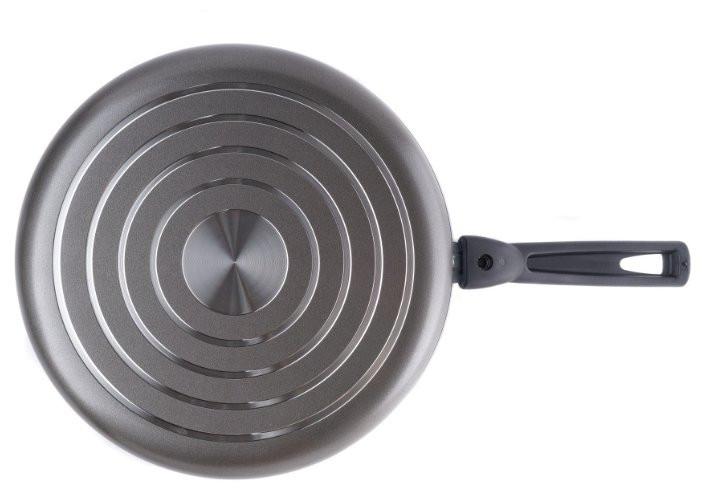 Сковорода обладает хорошими антипригарными свойствами. Съемная ручка очень удобная и за год службы не вышла из строя. Приобретал сковороду диаметром 28 см для возможности готовки больших объемов. Качество хорошее. Крепление ручки на клепках довольно крепкое, за время эксплуатации не разболталось и не сломалось. Антипригарное покрытие со временем своих свойств не потеряло.