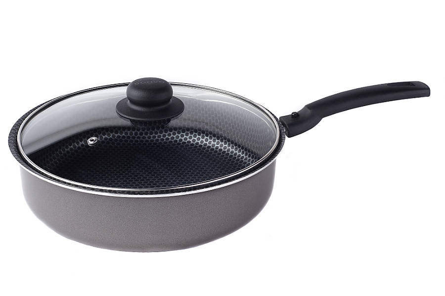 Сотейник с антипригарным покрытием. Съемные ручки из термостойкого пластика в линии «Discovery» помогают решить проблему свободного места на кухне при хранении посуды и позволяют использовать ее в духовке. Внутреннее антипригарное покрытие дает возможность приготовления пищи с минимальным количеством масла, не содержит PFOA. Крышка изготовлена из стекла с отверстием для выпуска пара.