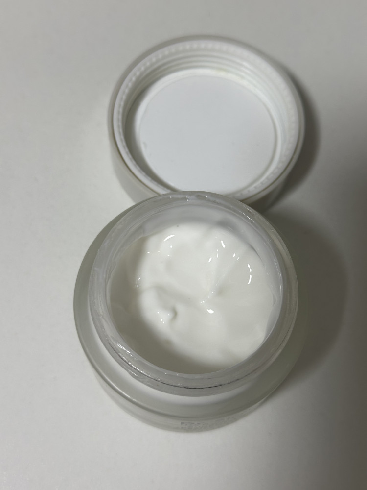 Баночка стеклянная, тяжёлая, но маленькая. На первый взгляд даже разочарует, но крем забит доверху, 50гр. Есть защитная мембрана. Крем белый, густой, с ненавязчивым ароматом. Если при нанесении крема, немного отвлечься, то распределять крем трудно. То ли быстро впитывается, то ли испаряется влага в креме!? После нанесения не оставляет жирного блеска и чувства "тяжести" на лице. Кожа мягкая и увлажненная.