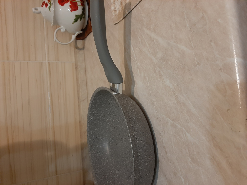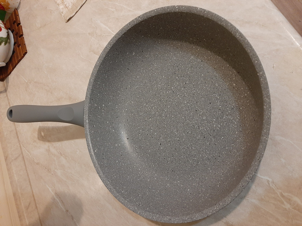 Сковорода - то, что надо! Диаметр верха 24см, диаметр дна 17см, высота борта 6,5см. Мне особенно понравилось, что она чуть глубже, чем обычно сковороды таких параметров, это удобнее. Тяжелая, стенки и дно толстые. Так как уже брала большую жаровню из этой серии светлый мрамор, то знала, что ничего не пригорает, отличное покрытие. Рекомендую.